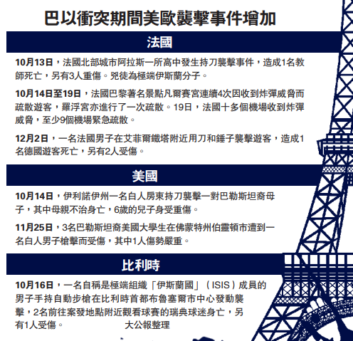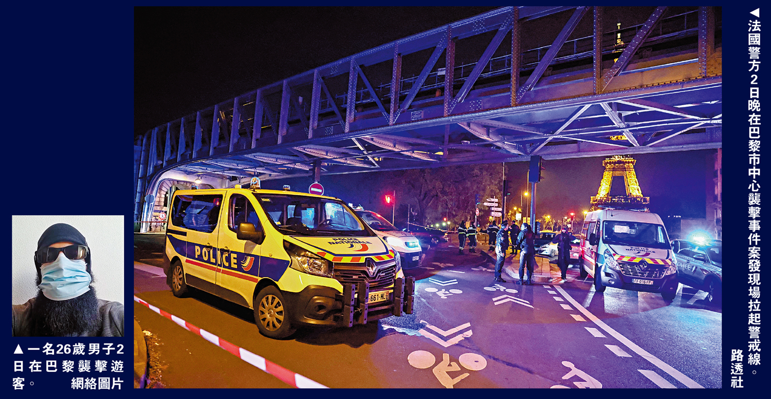 大公報綜合法新社、彭博社、《每日郵報》報道:本輪巴以衝突爆發以來,美歐多國涉極端主義及仇恨犯罪的襲擊事件頻發。當地時間2日,一名法國男子在巴黎市中心艾菲爾鐵塔附近用刀和錘子襲擊遊客,造成一名德國遊客死亡,另有兩人受傷。該男子作案過程中在社交媒體上傳視頻,宣布對襲擊事件負責。他在被捕後聲稱自己「無法忍受穆斯林被殺害」,並指責法國是以色列在加沙地帶殺害巴勒斯坦人的「共犯」。法國總統馬克龍稱,這是一宗恐怖襲擊事件。兇徒患有精神疾病,2016年曾因企圖發動襲擊被判囚4年。