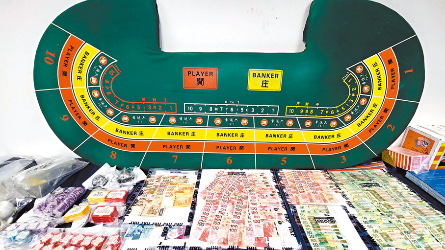 新界北總區反三合會行動組總督察歐陽德昨日表示,由上月2日至27日期間,警方首先在上水及打鼓嶺一帶破獲1間百家樂賭檔、兩間麻將賭檔、兩間釣魚機賭檔,以及1個非法油站,分以經營非法賭博場所、在非法賭博場所內賭博、違反危險品條例及消防條例等罪名拘捕122人(20歲至75歲),檢獲現金、不同賭具及犯罪得益等合共約100萬元,相信當中涉及一個活躍區內的黑幫組織操控。為進一步打擊該個黑幫的收入來源,警方同時展開一系列的財富調查,進一步揭發該黑幫操控另一個洗黑錢集團。