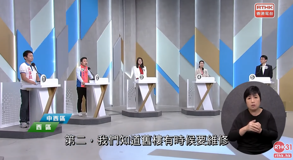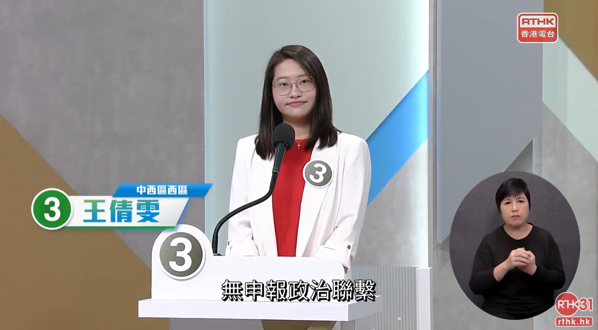 至於3號候選人王倩雯,則回應如何協助當區「三無」大廈成立法團。她表示,如果能當選後,會首先同民政事務處合作,優化大廈管理法團諮詢服務計劃,透過區議員作為諮詢架構,連結居民,建立居民大使,協助及引導他們成立法團,更好地管理自己的大廈,尤其是集中處理滲水、衞生等嚴重問題。