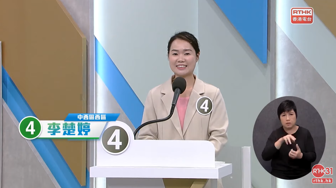 問及區內人口老化問題,4號候選人李楚婷希望以身作則,鼓勵身邊更多年輕人服務社區,關愛區內長者。她表示區內牙科保健服務名額不足,而且服務範疇亦十分少,日後將會致力爭取更多醫療設施及牙科保健服務,擴展服務範圍至補牙、鑲牙。