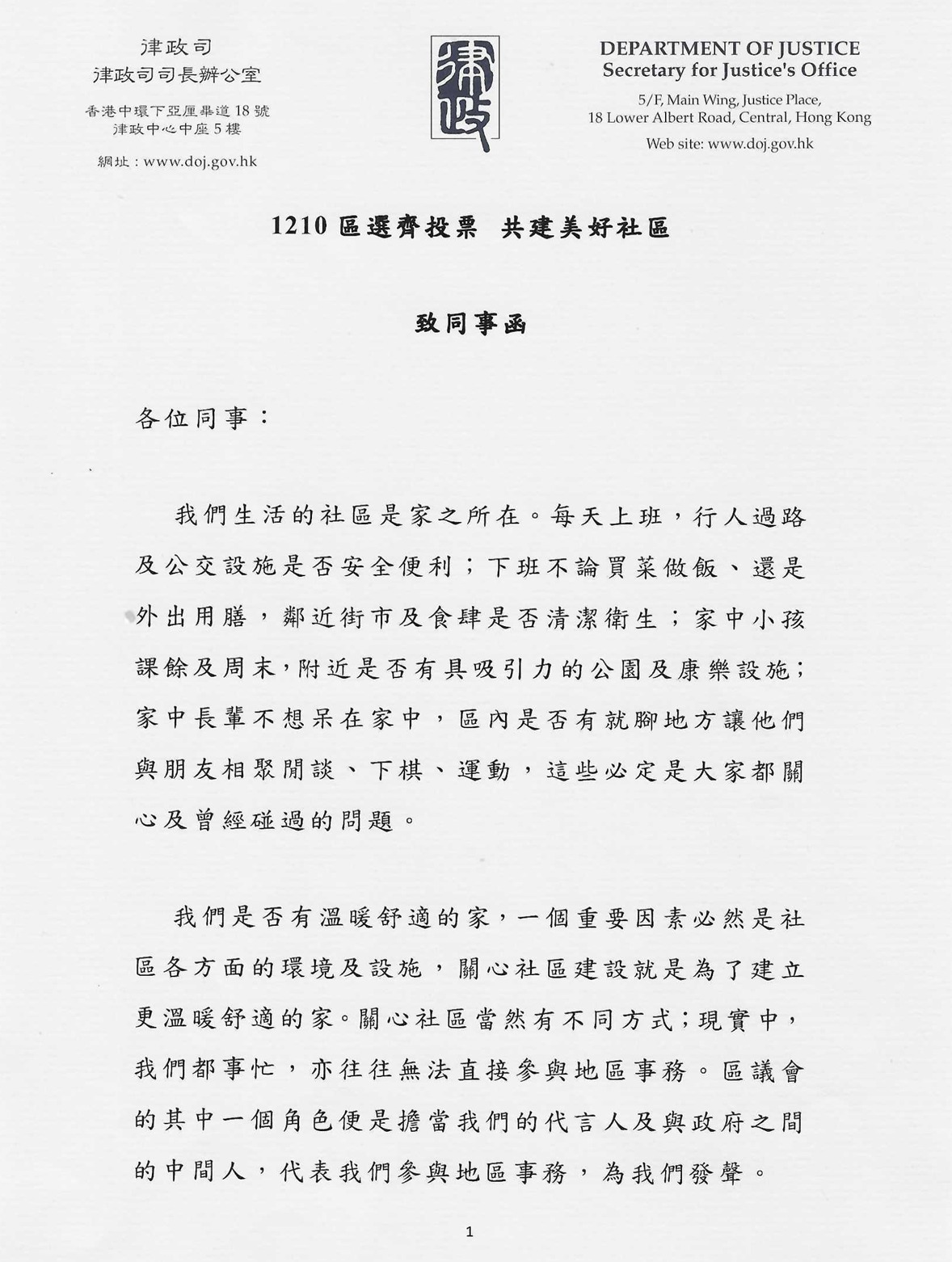 大公文匯全媒體報道,2023年區議會一般選舉將於12月10日(星期日)舉行,律政司司長林定國在社交平台發文,指今日(4日)向全體律政司同事致函,鼓勵同事們與家人、朋友,利用手上重要的一票,共建美好社區。