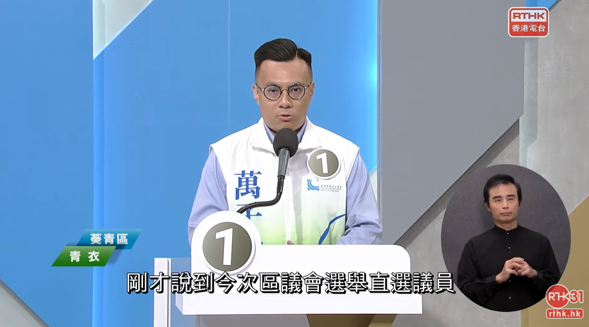 (大公文匯全媒體記者 袁由)繼香港再出發大聯盟之後,香港電台亦舉辦2023年區議會選舉論壇。青衣選區於本屆區議會選舉共有四名候選人,分別是1號萬子殷(經民聯)、2號彭熠銘(工聯會)、3號李旺東(無申報政治聯繫)和4號盧婉婷(民建聯)。
