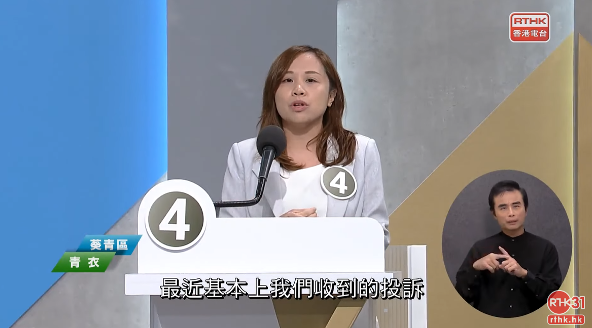 4號候選人盧婉婷則回應發展青衣方艙用地。她表示,區議會已就相關土地進行討論,該地原定發展成大型物流中心,期望能提前與政府商討,善用相關土地,增設更多私家車、貨車車位,甚至增設智能化停車場,讓居民享用之餘,亦能配合鄰近貨櫃碼頭的發展。