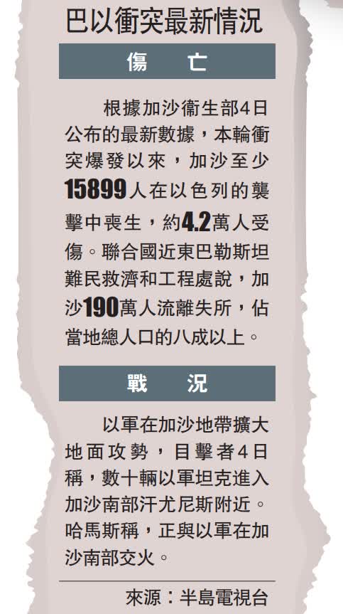 伊朗外長阿卜杜拉希揚2日警告稱,若以軍不停止對加沙和約旦河西岸的軍事行動,地區衝突將進一步擴大。但以軍總參謀長哈萊維3日宣稱,以軍已開始在加沙南部展開作戰行動。以軍發言人哈加里稱,以軍正將地面攻勢擴大至加沙所有地區。法新社4日援引目擊者報道稱,數十輛以軍坦克進入加沙地帶南部汗尤尼斯附近。以軍還聲稱,本輪衝突中已對加沙實施了約1萬次空襲。