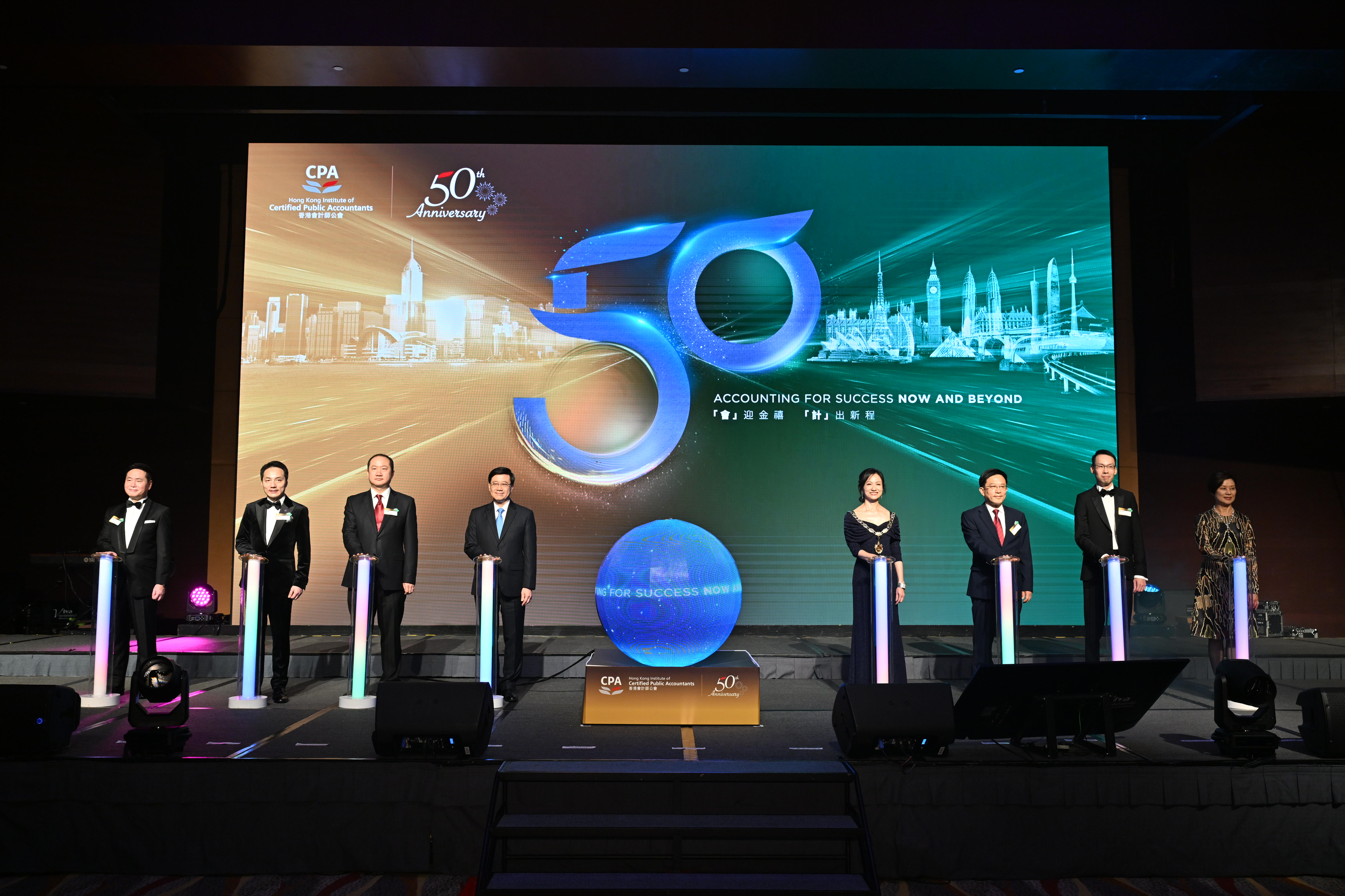大公文匯全媒體報道,為慶祝成立50周年,香港會計師公會昨晚(4日)舉行「50周年慶祝晚宴」。晚宴假香港會議展覽中心會議廳舉行,獲行政長官李家超出席擔任主禮嘉賓。李家超聯同中央政府駐港聯絡辦王松苗秘書長、外交部駐港特派員公署王劍參贊、香港會計師公會會長方蘊萱、副會長梁思傑及歐振興、行政總裁兼註冊主任陳詠新及五十周年籌備委員會主席羅卓堅一同主持亮燈儀式,為晚宴揭開序幕。