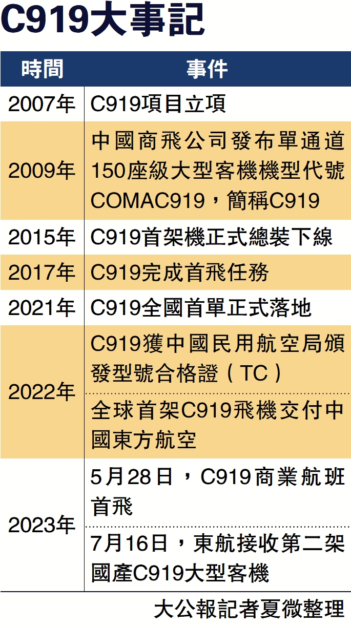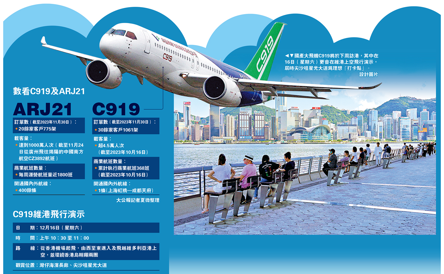 (大公報記者 古倬勳、楊州)我國自主研製的大飛機C919和支線客機ARJ21將於下周二至周日(12至17日)首次到訪香港,向全球展現中國航空製造業實力。C919更會於16日在維港上空飛行演示,屆時市民可在灣仔海濱長廊、尖沙咀星光大道等,一同見證國產大飛機翱翔香港上空的一刻。
