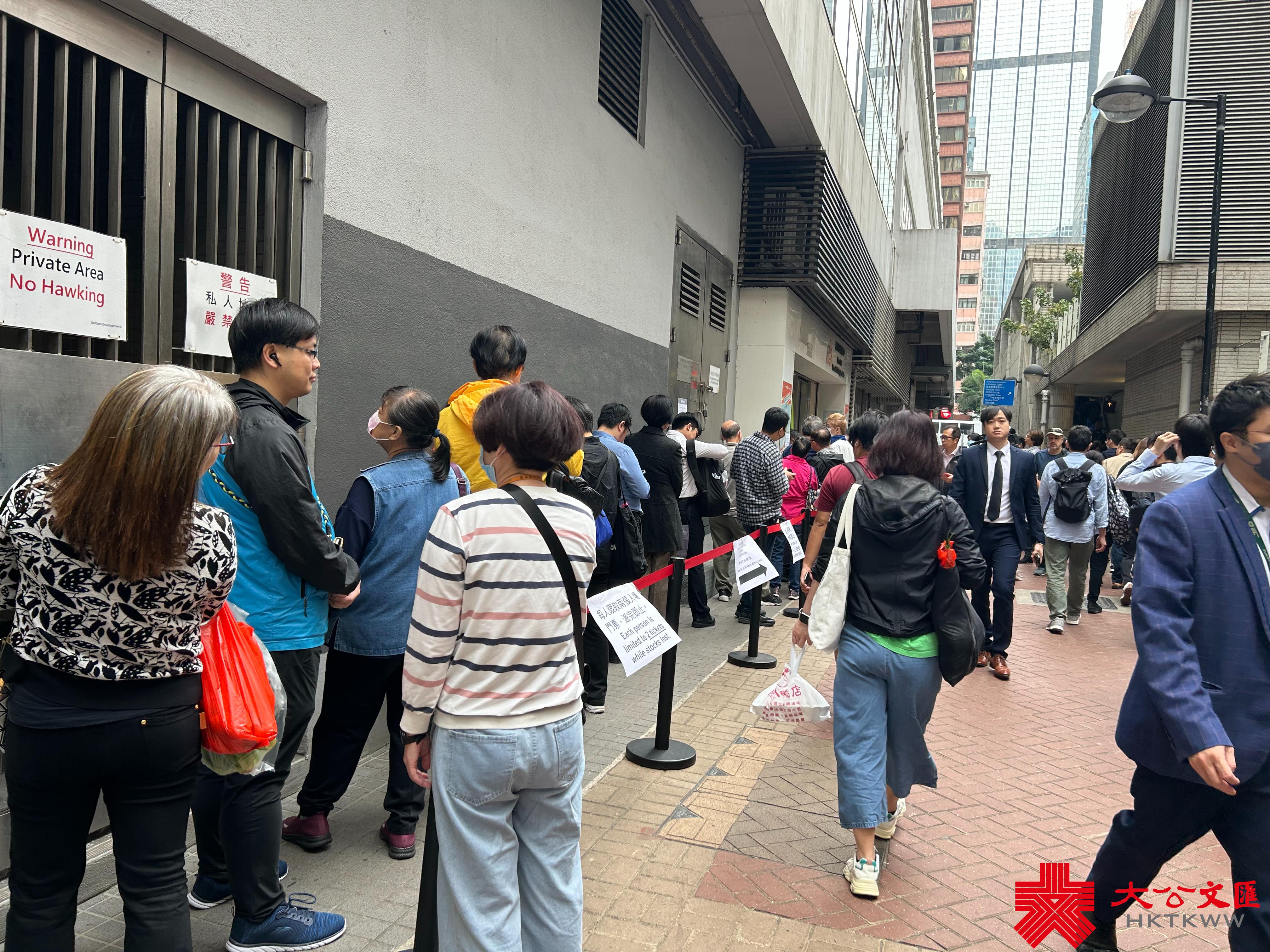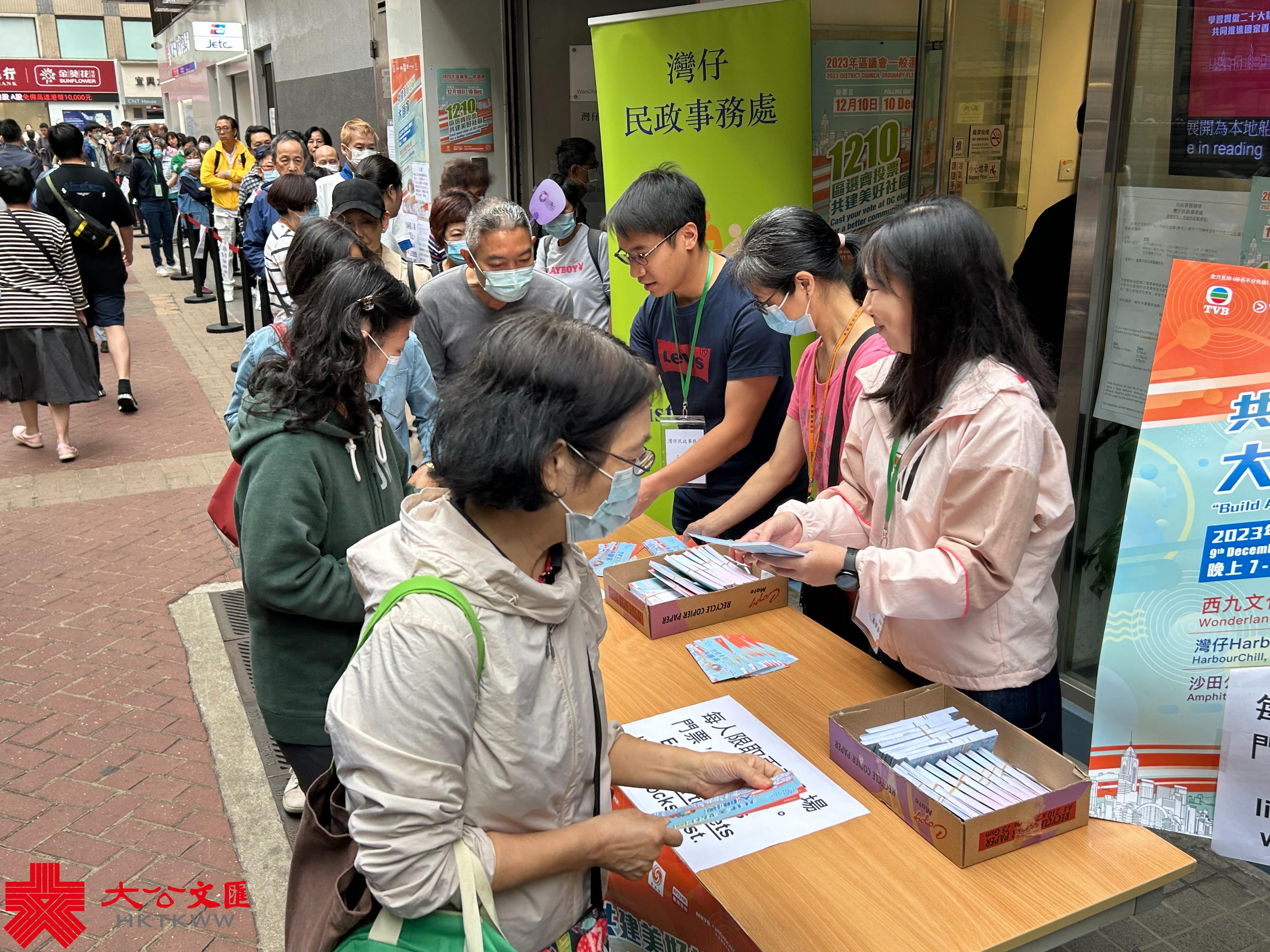 大公文匯全媒體記者於中午12時40分許到達灣仔民政諮詢中心,儘管距離開始派入場券還有20分鐘,中心門外已排起長龍。身穿牛仔外套排頭位的先生甚至提前半個鐘就來到現場排隊。市民反應踴躍,派劵開始後僅8分鐘,西九竹翠公園門票就已經派完,而不到15分鐘,灣仔衛星場地入場券亦都派完。