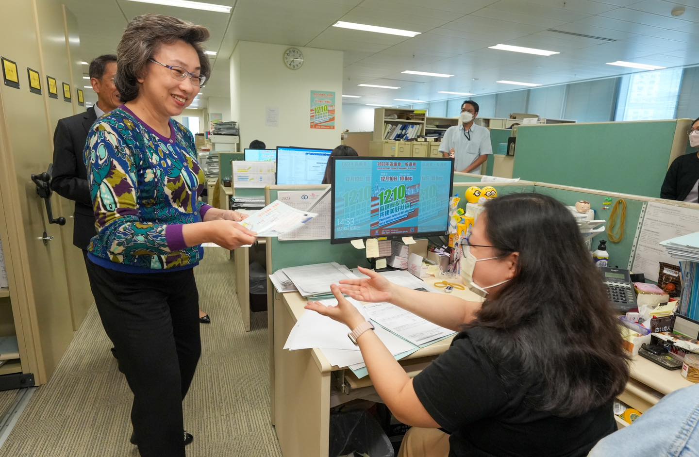 楊何蓓茵今日聯同常任秘書長梁卓文、3名副秘書長張馮泳萍、陳慧欣、劉思敏及一般職系處長陳信禧,到公務員事務局位於政府總部的4個辦公室樓層「洗樓」,派發1210區選單張,提醒同事當日投票需要注意的事項和程序,呼籲同事於1210撐區選、齊投票。據悉,公務員事務局部分同事當日有「雙重身份」,一是登記選民,二是負責選舉的工作人員,獲派至不同的工作崗位。有居住在市區的同事須在當日凌晨於離島展開工作,負責運送選票至票站;也有同事獲分派至懲教院所裏的票站,以及中央指揮中心工作。