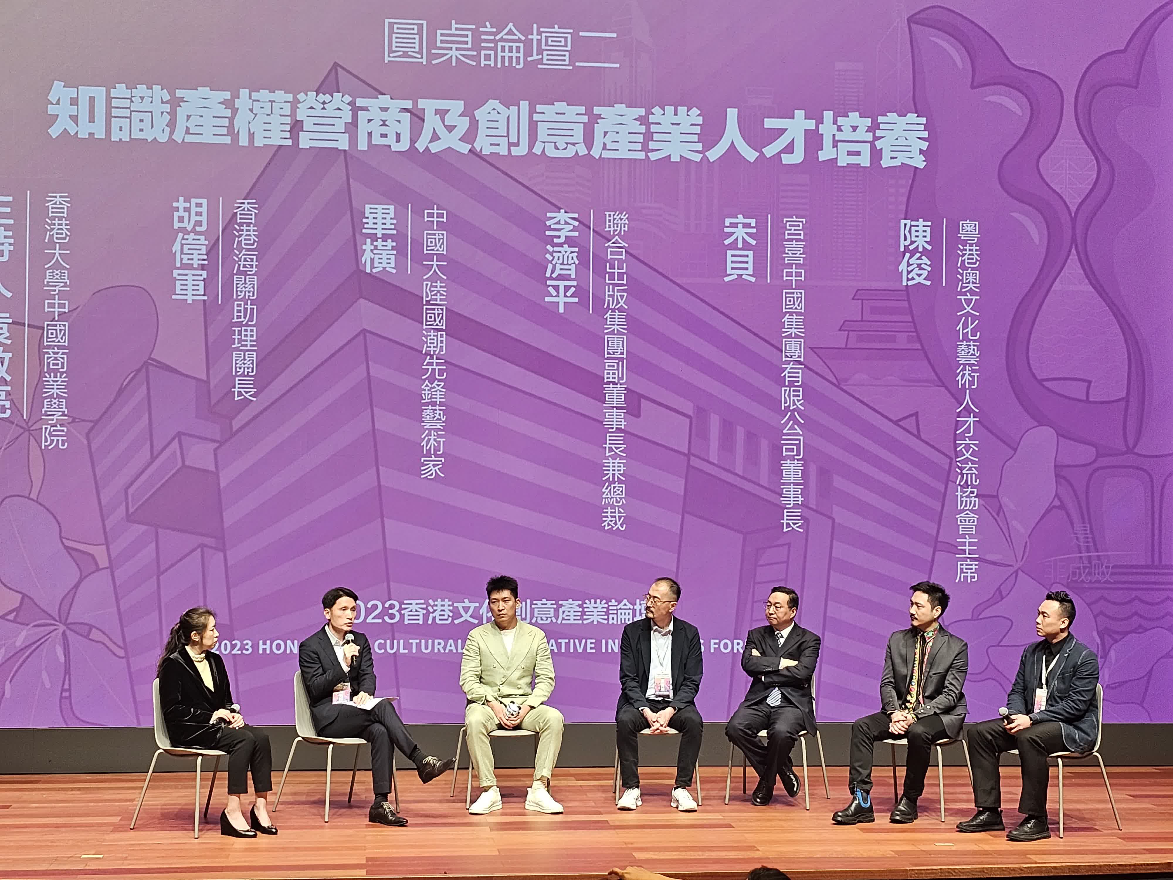 下半場以「知識產權營商及創意產業人才培養」為主題,香港海關助理關長(情報及調查)胡偉軍強調保護知識產權的重要性,並在現場介紹了香港當前在知識產權保護方面的的措施;聯合出版集團副董事長兼總裁李濟平和宮喜中國有限公司董事長宋貝分別從IP運營角度講述了各自如何在不同的業務板塊進行不同的IP運營。內地國潮先鋒藝術家畢橫分享了自己在做國潮過程中遇到的市場化的困難,並期待未來能夠將藝、政、商三者聯合共同創造新的IP。