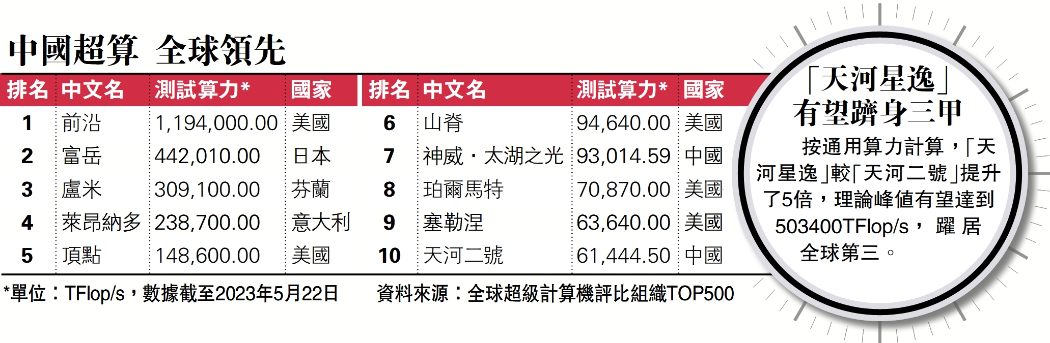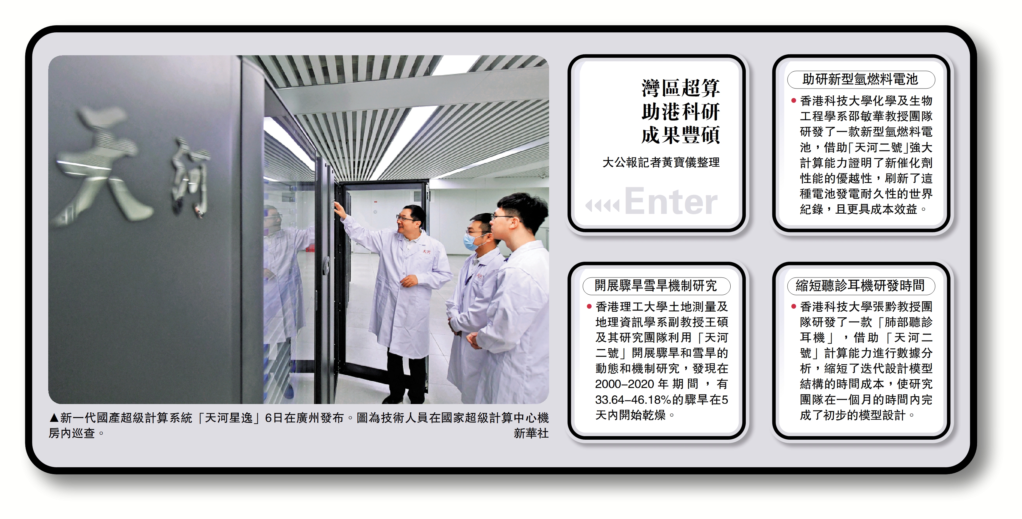 (大公報記者 黃寶儀 廣州報道)新一代國產超級計算系統─「天河星逸」6日在廣州舉行的2023年超算創新應用大會上發布。「天河星逸」在通用CPU計算能力、網絡能力、存儲能力以及應用服務能力等多方面較「天河二號」實現倍增,將更好服務包括港澳在內的用戶。香港擁有多所著名高校和科研人才團隊,對於超算的需求非常旺盛。未來,國家超算廣州中心將通過建設聯合實驗室等模式加強與香港科研機構合作,助力香港科研技術攻關和成果轉化。