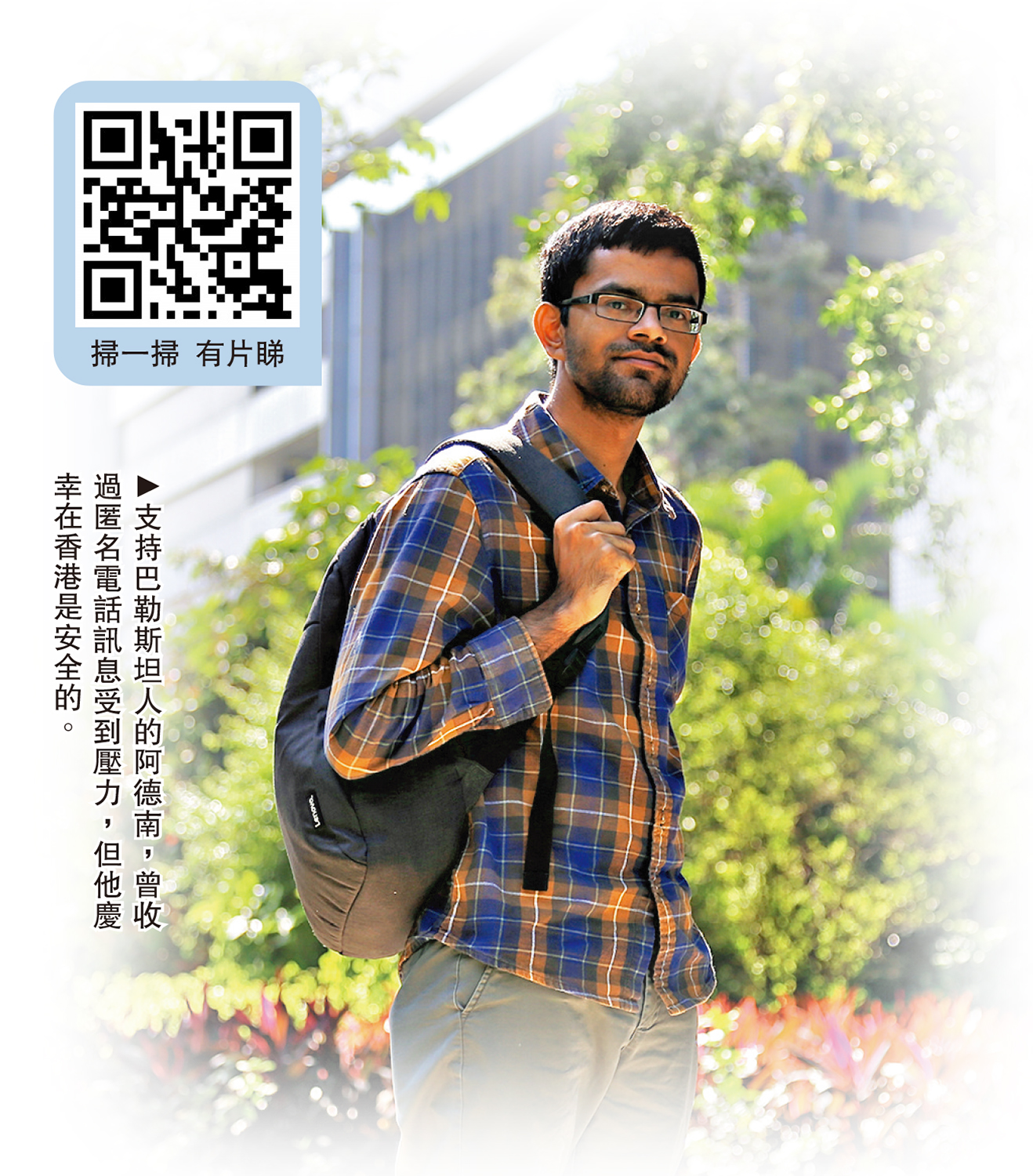 他指有美國的巴勒斯坦設計師,只因參與巴勒斯坦集會,之後便突然失去工作。早前美國佛蒙特州有三名巴勒斯坦裔學生在街頭被射擊中槍,案發時當中兩名遇襲的學生頭戴傳統阿拉伯頭巾(Keffiyeh)。另在美國哈佛大學的巴人學生,其個人資料被網上公開,有人租了一輛車張貼了這些學生的相片及個人資料,大字標題呼籲不要聘請這些學生。支持巴勒斯坦人的阿德南,亦收過匿名電話訊息,他坦言受到壓力,幸得到家人朋友支持,「好在香港是安全的,在這兒才體會到幸福。」