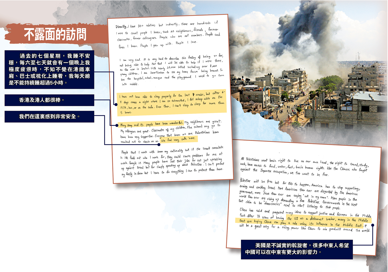 阿德南表示,巴勒斯坦人不能站出來接受訪問,否則會成為針對目標。「任何人離開巴勒斯坦例如加沙或約旦河西岸,均要獲得以色列政府批准,以色列政府是有名單記錄誰離開、誰進入巴勒斯坦人的聚居地。若我透露居港巴勒斯坦人的個人身份資料,對他們在加沙的親友有危險。」
