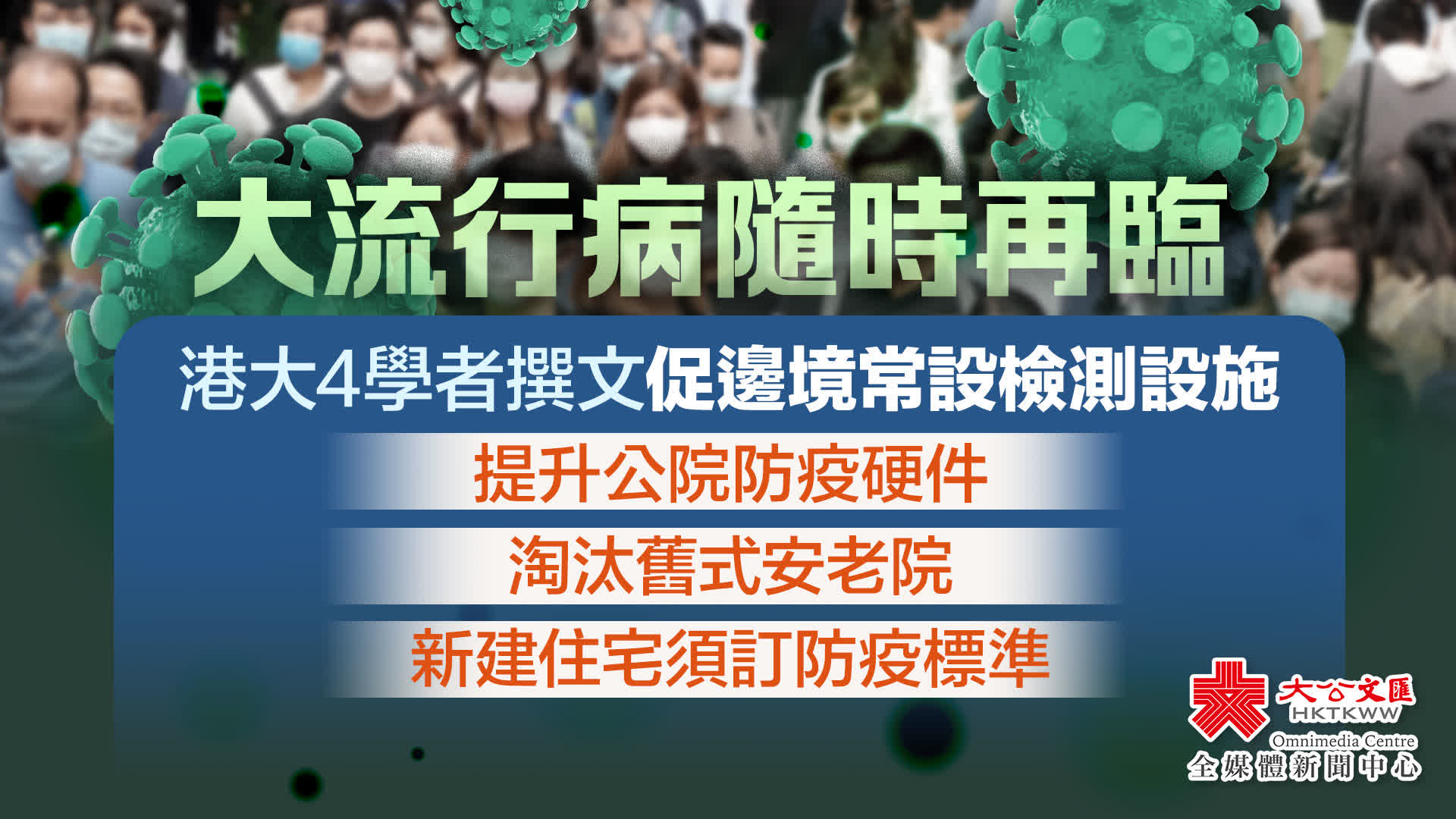 安老院是去年第五波疫情的重災區。文章提到,本港人口老化日趨嚴重,當疫症再臨,慘劇必重現。建議政府研究逐漸淘汰舊式安老院,興建大型一站式安老城,具備駐場醫護及醫療設施,為公院減壓。硬件標準須從感染控制角度出發,包括個人空間充足,例如只提供單人或雙人房,有足夠鮮風供應及獨立抽風系統。