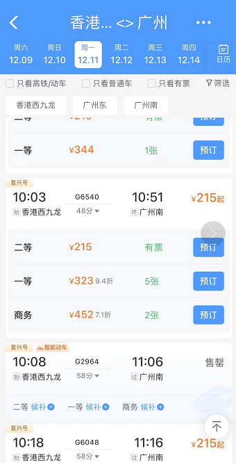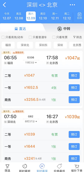 大公文匯全媒體記者實測,在12306APP搜索深圳至北京的列車,在查詢頁面點擊列車信息,可見折扣信息。記者又查看從香港出發前往廣州、佛山等城市列車,亦發現折扣車票,惟多數打折坐席為一等座或商務座。