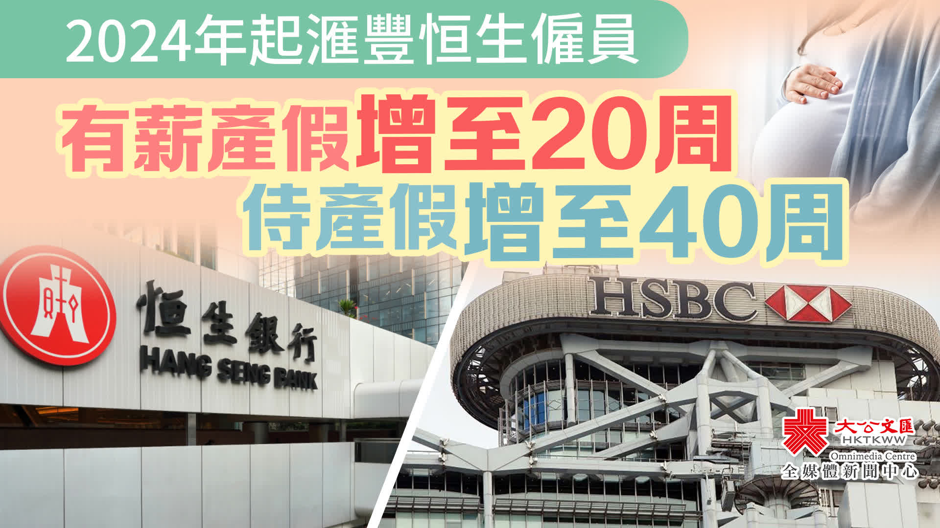 大公文匯全媒體報道,滙豐及恒生銀行宣布,2024年1月1日起,僱員有薪產假將由16個星期增加到20個星期,有薪侍產假則由10天增加到40天。