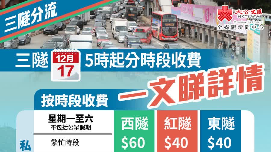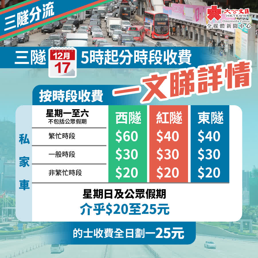 大公文匯全媒體報道,運輸署今日(7日)提醒市民,三條過海隧道,即西區海底隧道(西隧)、海底隧道(紅隧)和東區海底隧道(東隧),將於12月17日(星期日)上午5時起實施分時段收費。在「分時段收費」下,繁忙時段私家車使用紅隧及東隧,收費40元,比現時為高;非繁忙時段,三隧劃一減價至20元,運輸署估計繁忙時間過海私家車和電單車將減少10%。