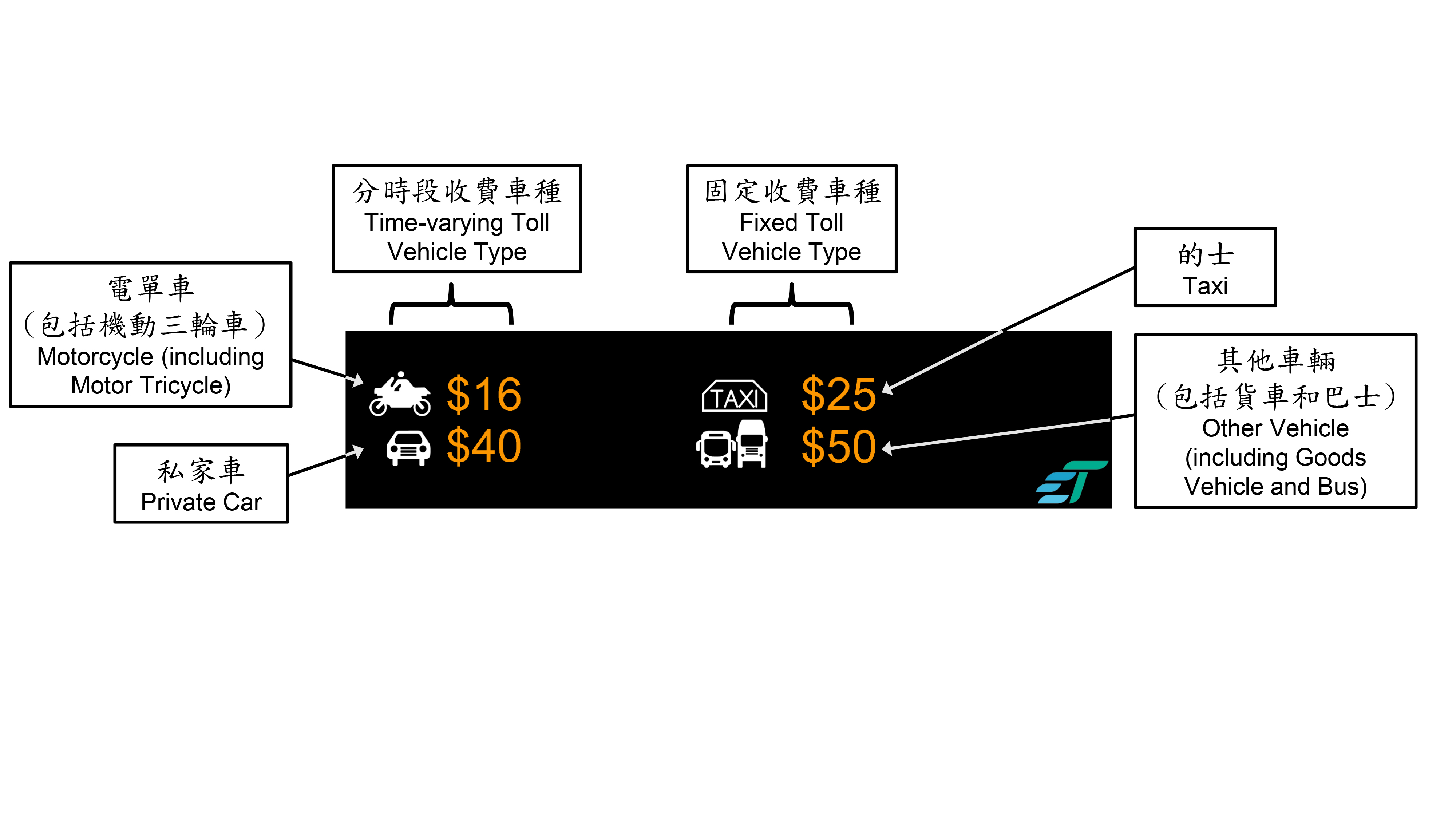 至於其他車種收費全日維持在固定水平,三條過海隧道的士收費繼續全日劃一25元,而其他商用車包括貨車、巴士等全日劃一50元。