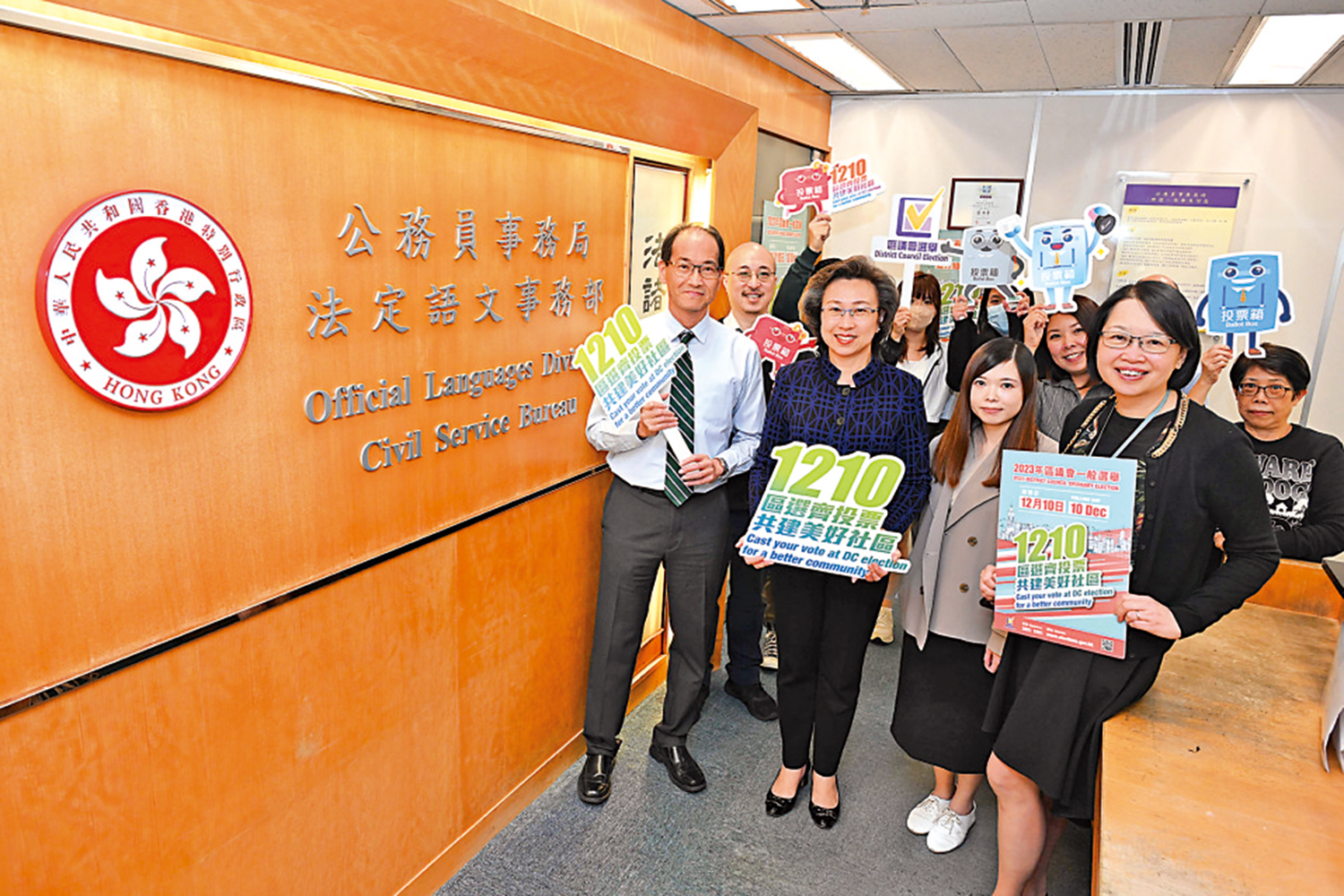 公務員事務局局長楊何蓓茵昨日到公務員事務局轄下法定語文事務部和一般職系處分別位於金鐘道政府合署和上環林士街多層停車場大廈的辦公室,向同事派發區選宣傳單張。她表示,今次區議會選舉關係到社區建設以及市民福祉,意義重大。重塑區議會是政府的重要政策措施,公務員既有責任支持,同時亦有公民責任,因此應以身作則,在這次區議會選舉中投票,履行其「雙重責任」。