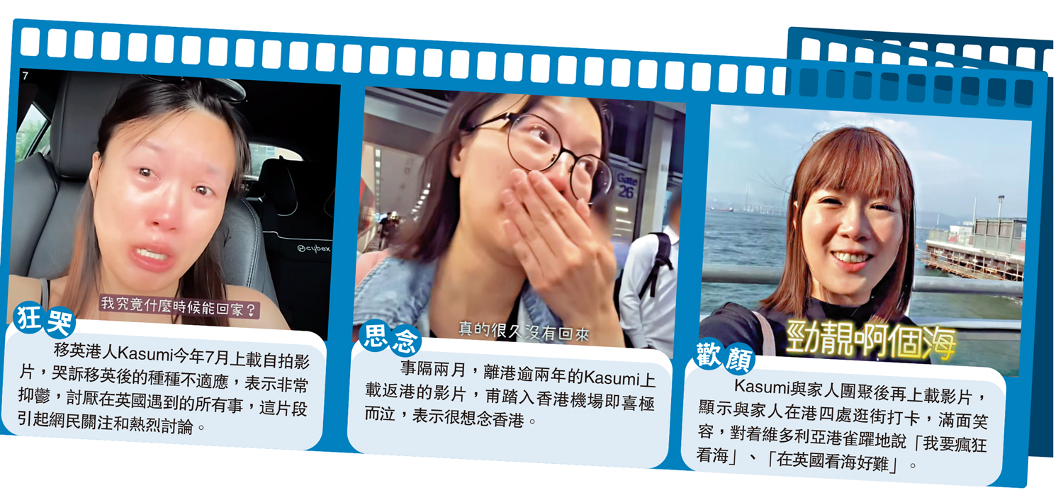 近期有不少移英港人通過社交網站指出,英國並不是想像中那麼美好,民眾飽受通脹之苦,各行業示威和罷工此起彼伏,生活品質明顯下降,對比在香港安全安心的生活天差地別。Kasumi與丈夫及女兒移民至英國已近三年,不時在YouTube上分享移英生活近況。早前她在影片哭訴移英後的種種不適應,表示自己非常抑鬱,討厭英國遇到的所有事。她的崩潰情緒累積至頂點,不斷萌生離開英國的念頭。在細說各種難處時,她更忍不住狂飆淚,大數當地五大生活苦況,包括天氣乾燥,皮膚變差;要重新建立社交圈;生活枯燥乏味重複;極度想念香港家人;想回港但機票極昂貴。