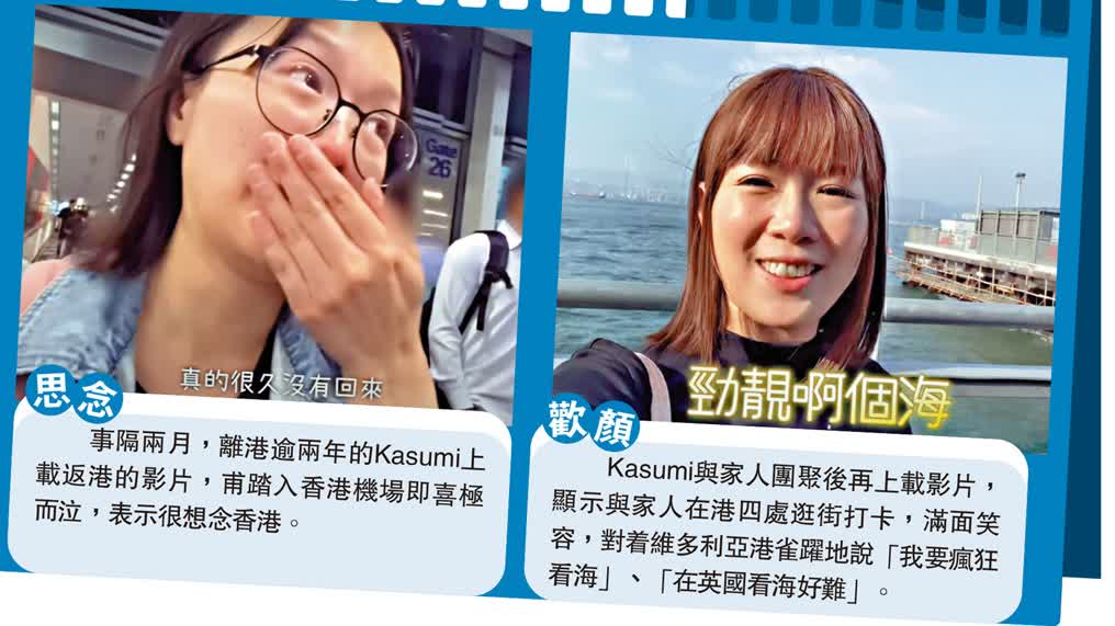 (大公報 記者 龔學鳴)英國早前推出所謂優先處理簽證服務,誘惑持有BNO的港人移民,不少港人移英後很快便感後悔。早前在網上拍片「爆喊(大哭)」指自己情緒非常抑鬱、不斷萌生離開英國念頭的移英港女Kasumi,近期已隻身返港。她落機後心情激動,喜極而泣說:「我終於返到啦!」她透露其實由飛機窗望到香港的山峰就開始落淚,直到抵港看到中文字終於笑逐顏開,覺得還是香港好:「兩年10個月,終於返到香港了!」