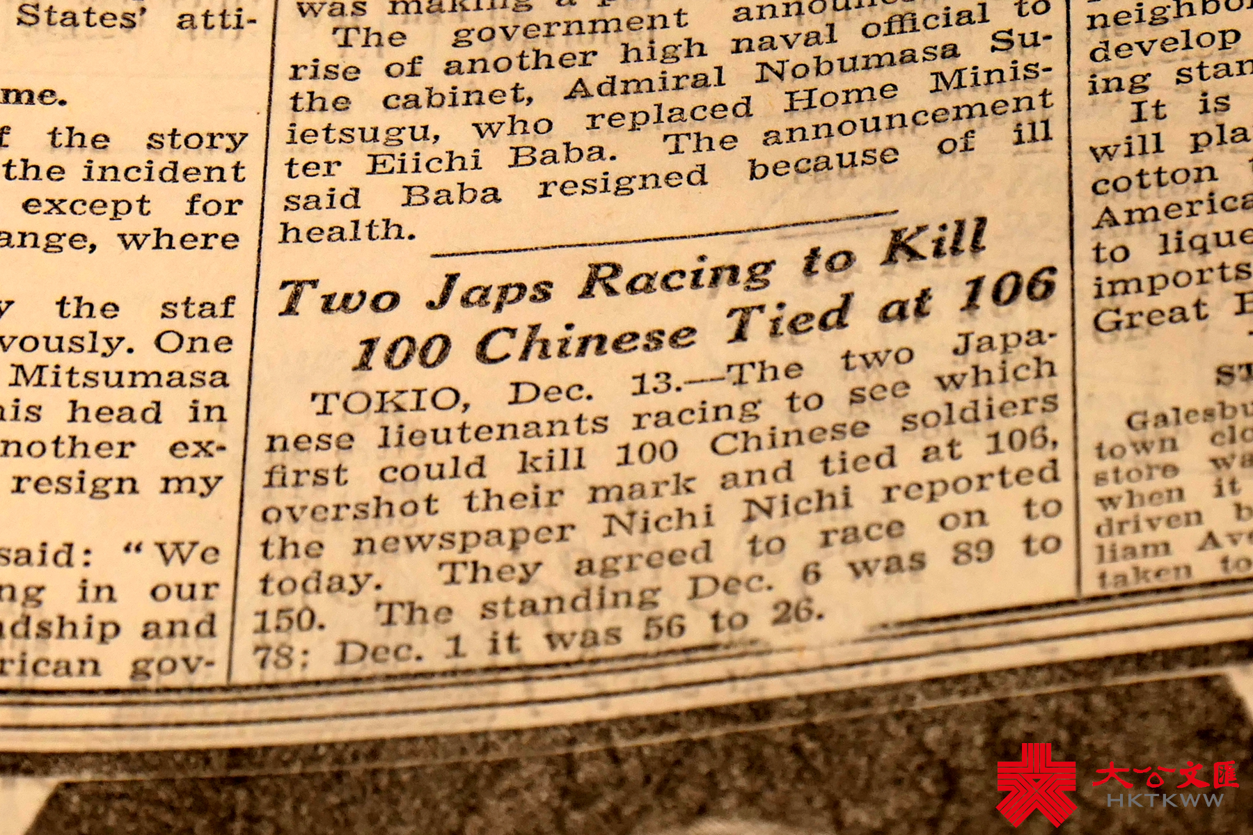 其中,1937年12月6日美國《紐約時報》和1937年12月14日美國《芝加哥每日論壇》,均轉載了日本報紙中有關兩名日本軍官進行「百人斬」競賽的報道。《紐約時報》報道中說:「來自上海前線的一份電報詳細介紹了兩名日本少尉之間的一場比賽,看誰先殺死100名中國人。26歲的野田毅和25歲的向井敏明,把賭注壓在了這項成就上,並一直在努力贏得賭注。」