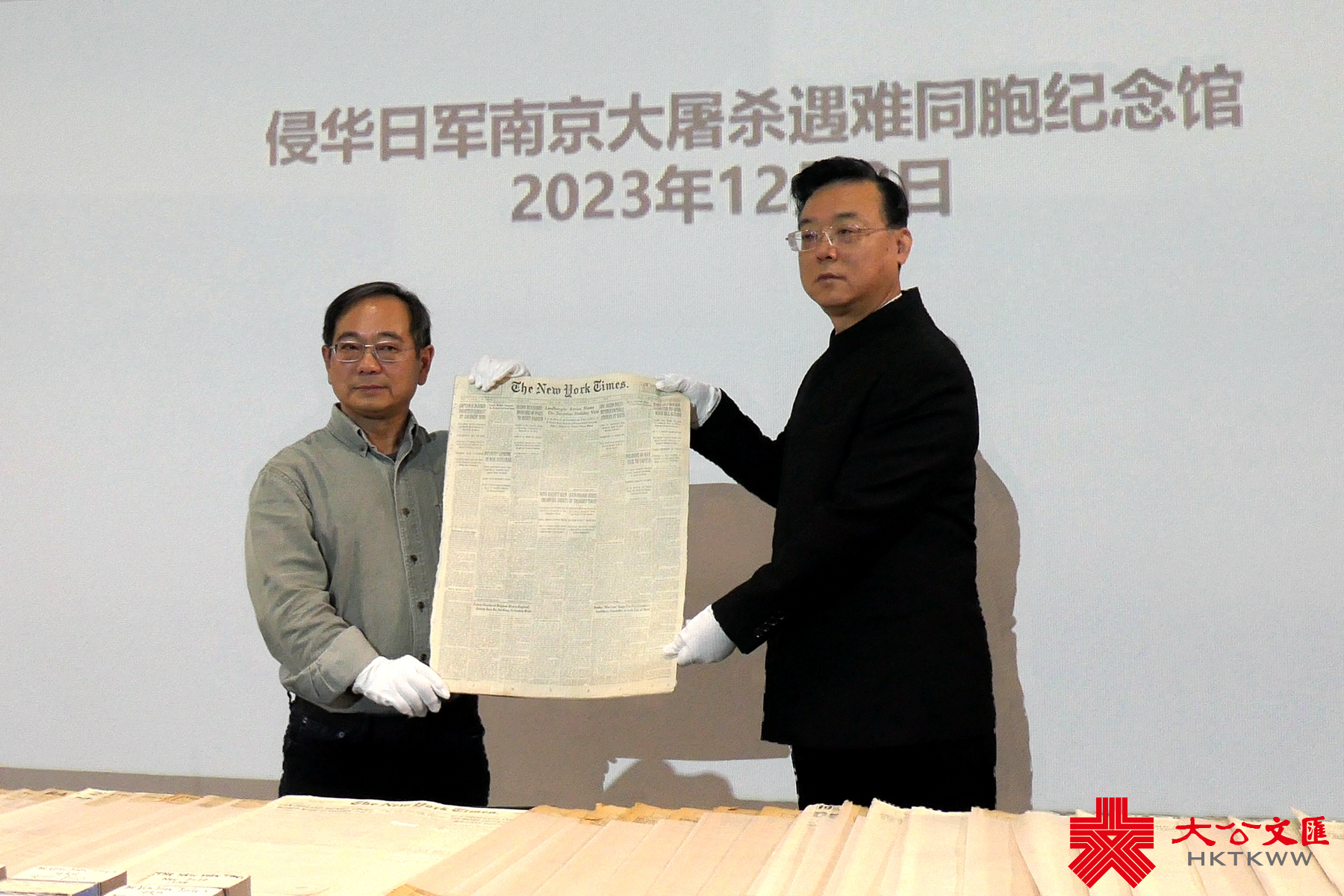 (大公文匯網記者 賀鵬飛 南京報道)美籍華人魯照寧今日(8日)向侵華日軍南京大屠殺遇難同胞紀念館捐贈其在美國四處搜尋的125份美國報紙,其中兩份報紙明確報道了兩名日本軍官進行「百人斬」競賽的罪行。學者指出,這是第一次見到西方媒體對「百人斬」殺人競賽進行報道,這些報紙具有重要的史料、文物和展陳價值。