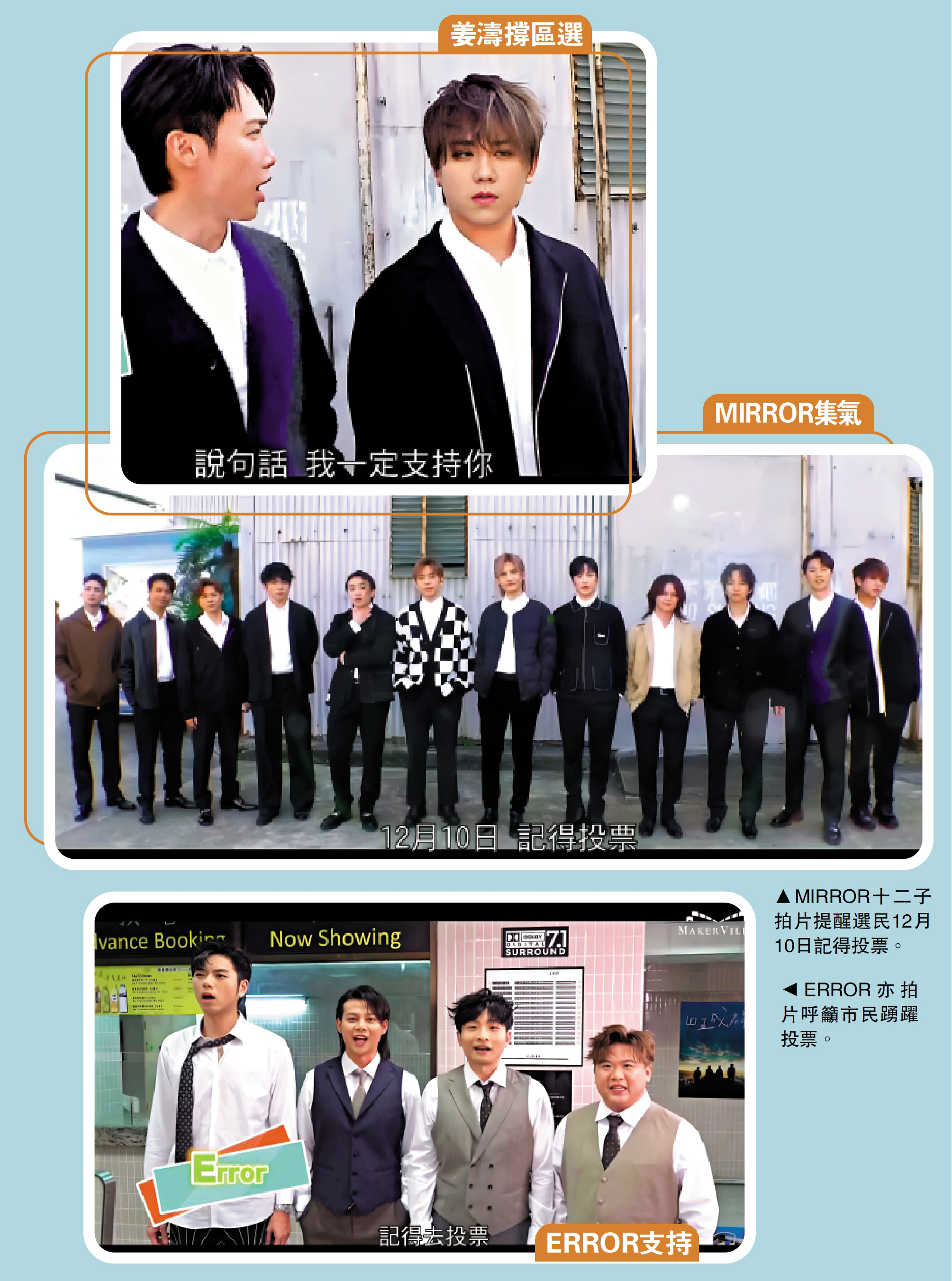 人氣組合MIRROR、ERROR和P1X3L的成員昨日在電視節目上呼籲市民投票。在影片中,MIRROR十二子一字排開拍片呼籲選民「12月10日記得投票」。另外,ERROR、P1X3L成員亦拍攝短片,提醒大家「記得去投票」。