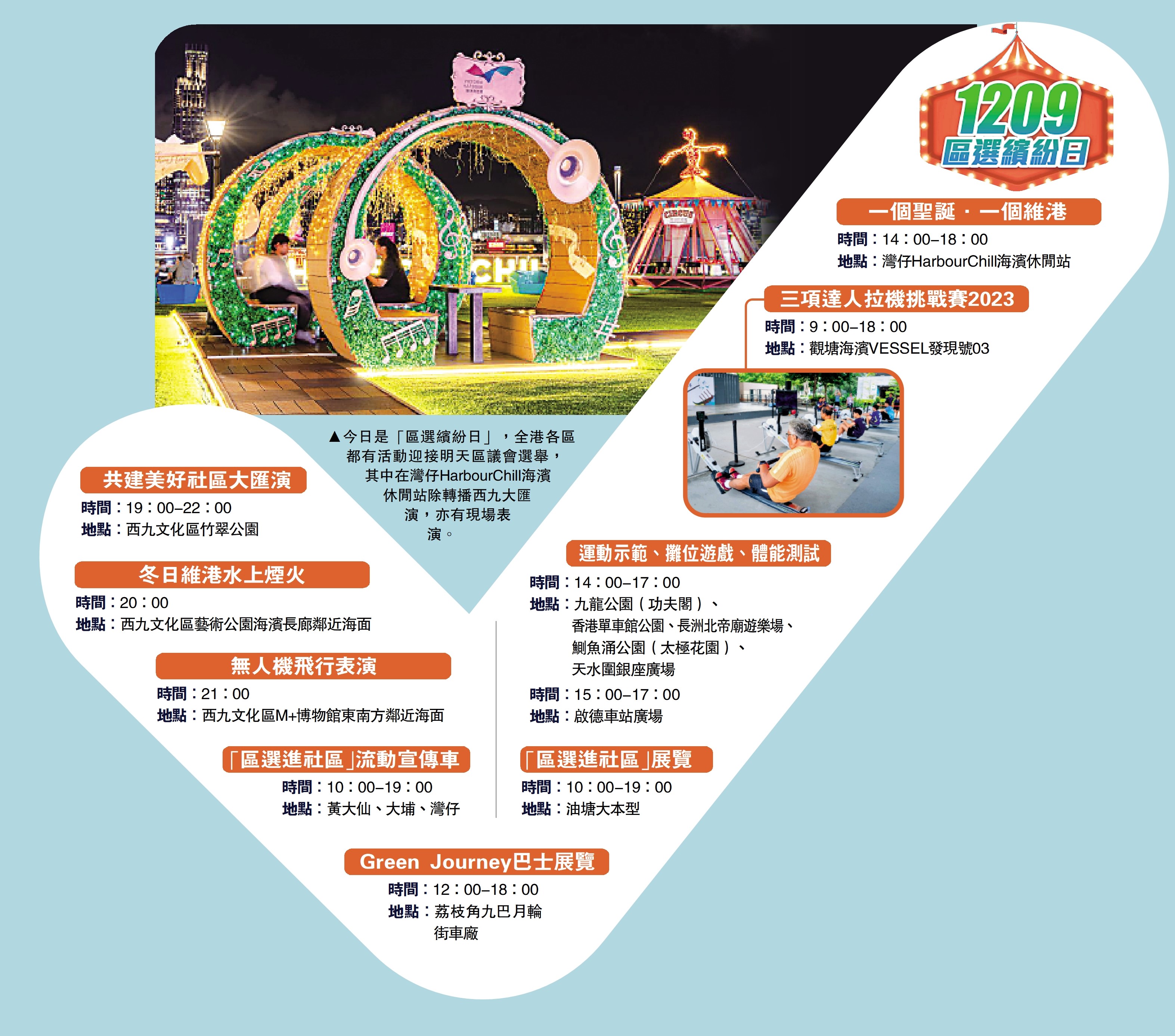 (大公報記者 義昊)參加嘉年華、觀看免費展覽、欣賞西九大匯演,還有無人機與煙火表演……今日是「區選繽紛日」,全港各區都有豐富多彩的活動和優惠,以歡樂的氛圍迎接區議會選舉。特區政府鼓勵市民積極履行公民責任,在明日的區選日踴躍投票,選出為民服務的區議員,共同建設更美好香港。