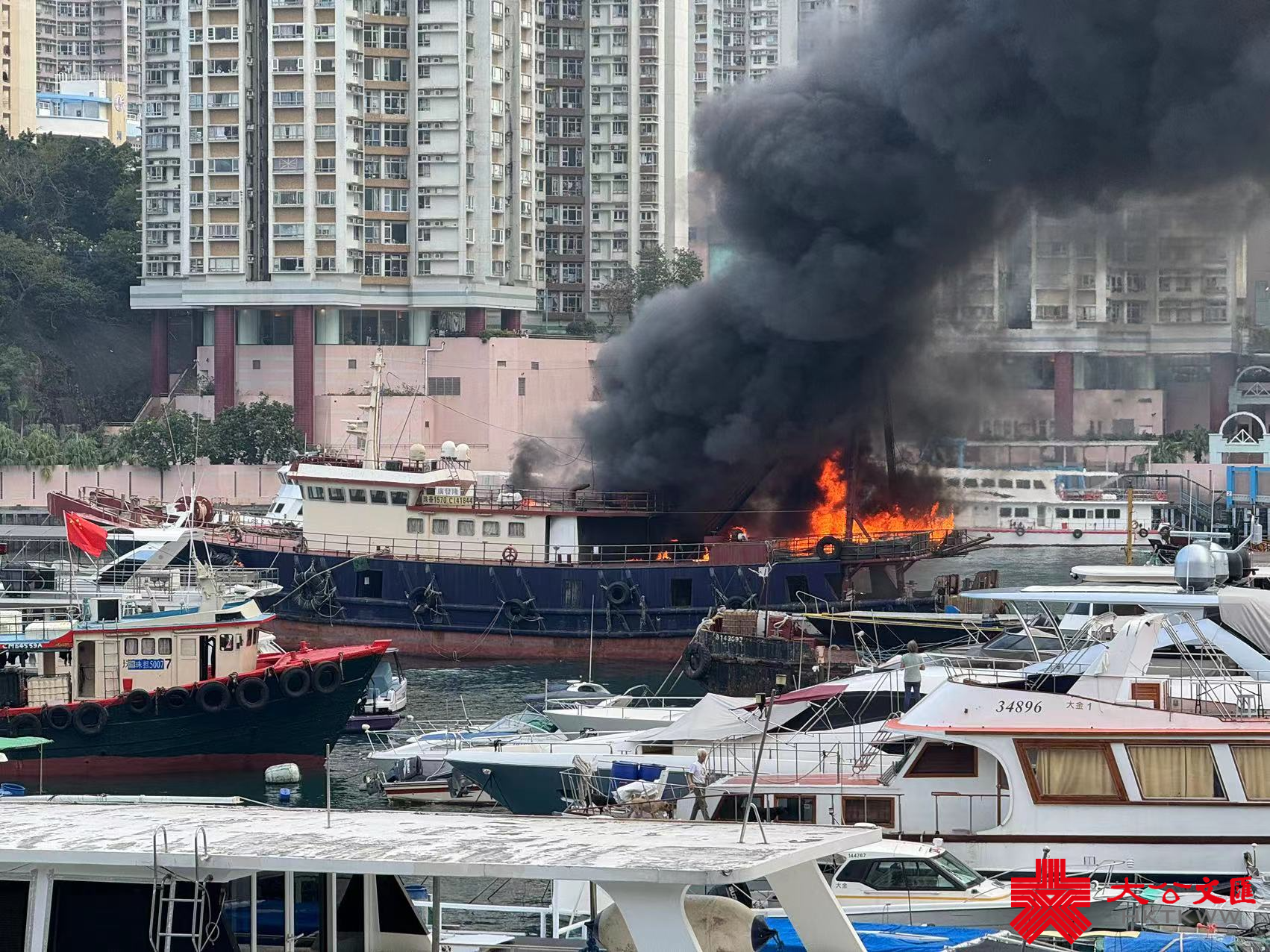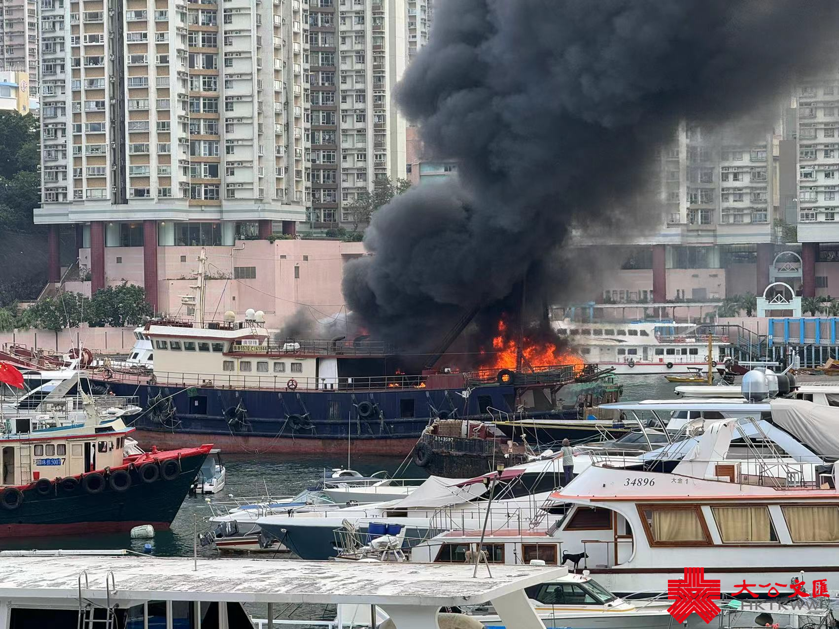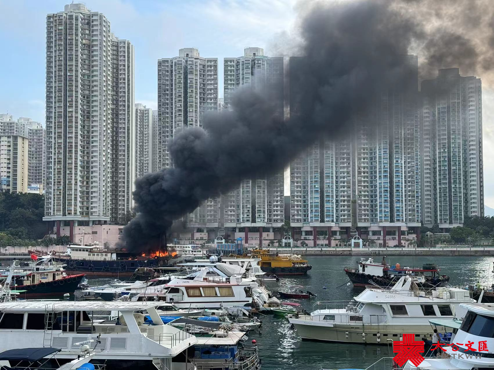 大公文匯全媒體報道,香港仔南避風塘今日下午(9日)有一船隻着火,火勢驚人,黑煙席捲半空。
