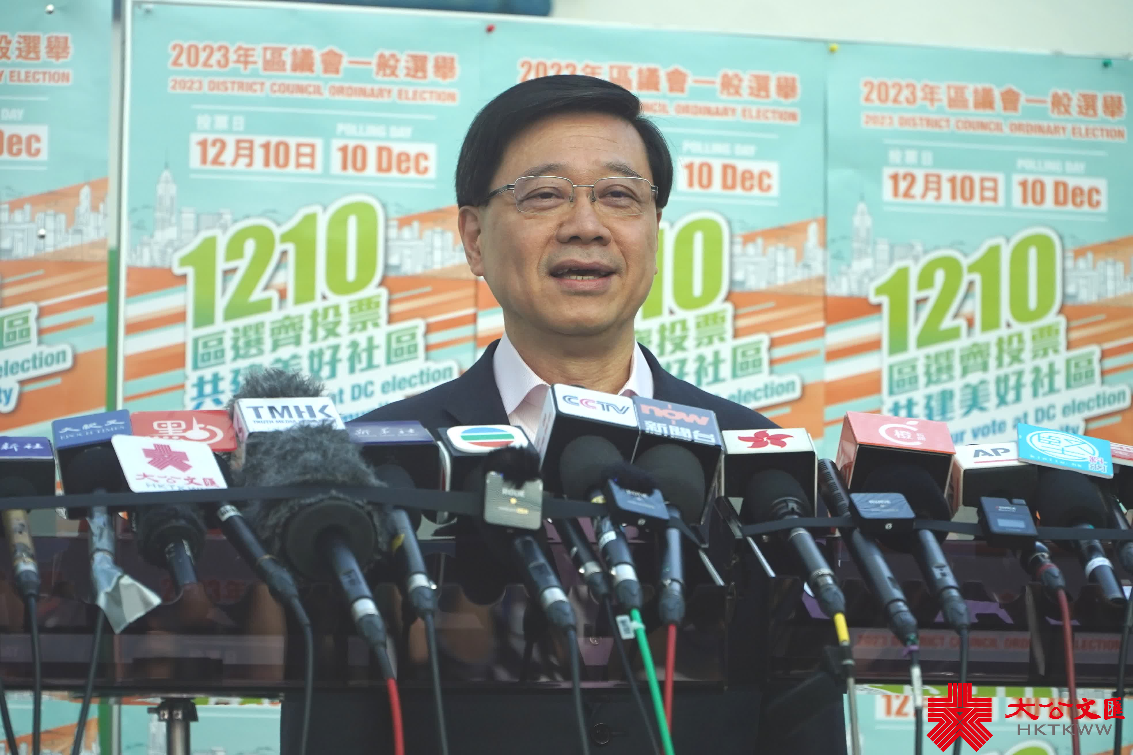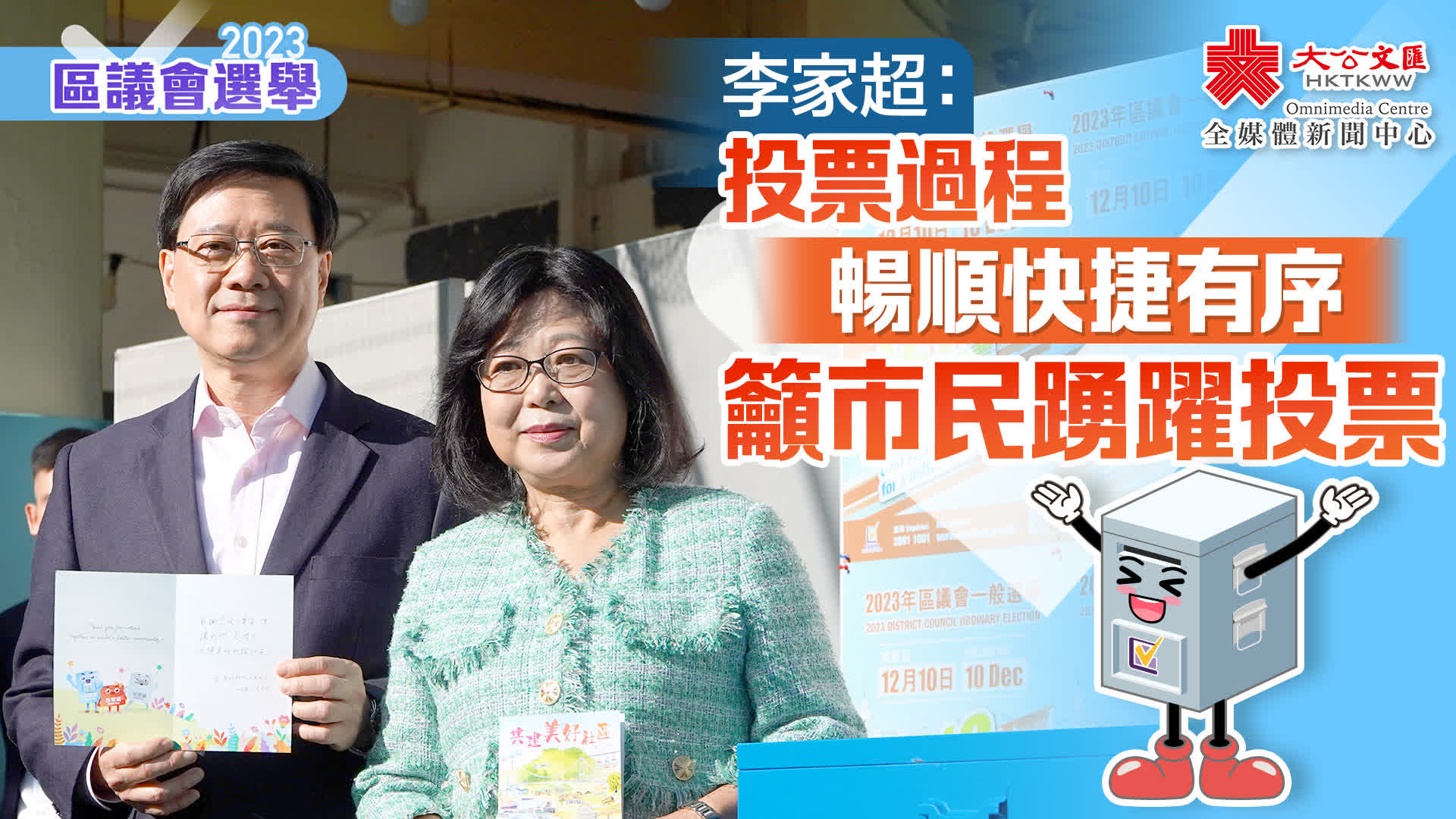 (大公文匯全媒體 記者 馮書朋)2023年區議會一般選舉今日(12月10日)舉行,全港各區票站準備就緒,選民齊齊投票。今日上午9時15分,行政長官李家超偕夫人前往半山高主教票站投票。李家超投票後見記者時表示,投票過程暢順、快捷及有序,票站內同時有其他居民一同投票,票站內的同事專業、有熱情,多謝工作人員。