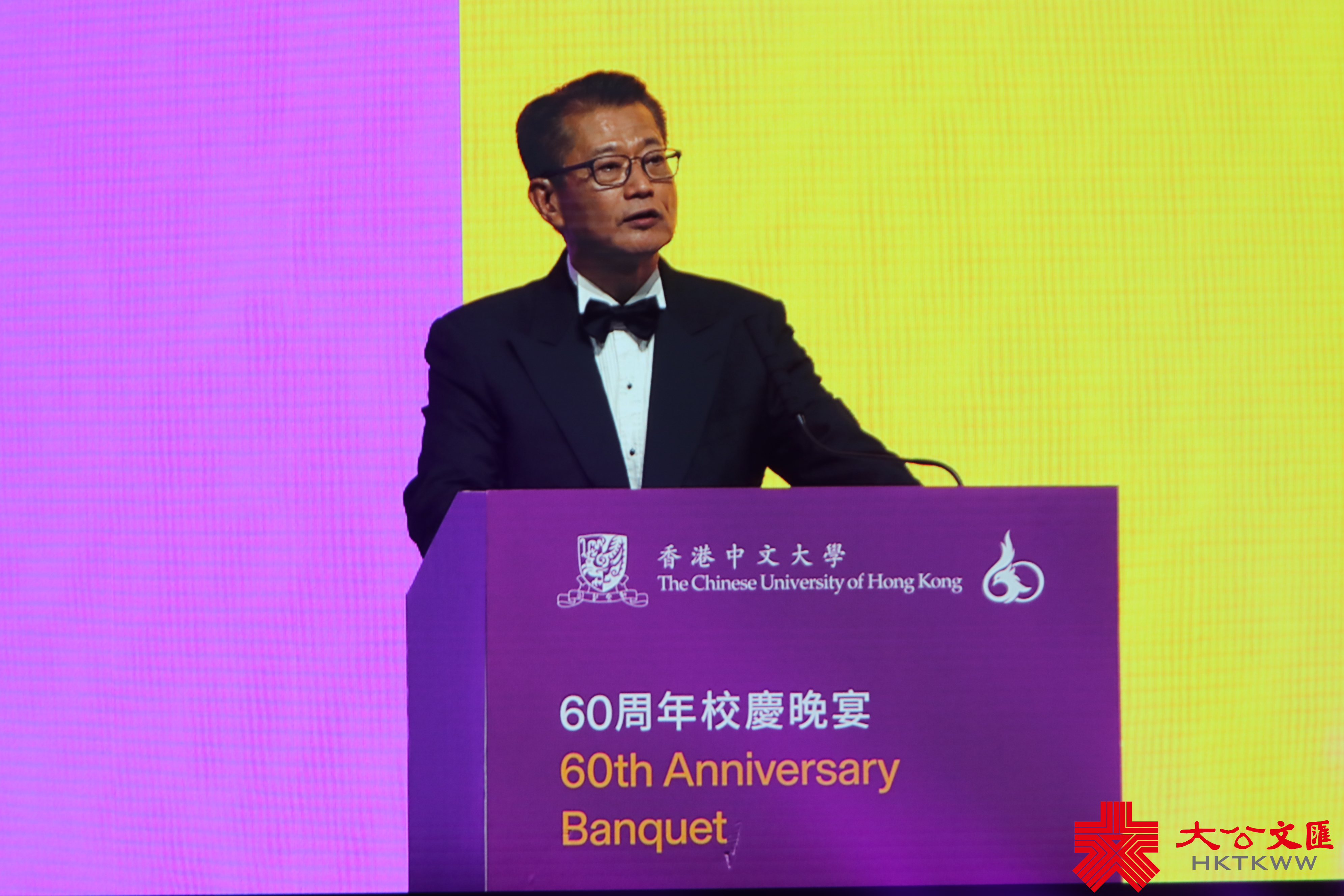 (大公文匯全媒體記者 趙之齊)香港中文大學(中大)今日(10日)舉行六十周年校慶晚宴,超過2000名中大師生、校友、合作夥伴匯聚一堂。財政司司長陳茂波到場主禮,表示自己作為中大校友感到自豪,稱中大人共同的特質就是「關心大學的發展,就像關心香港和國家一樣」,亦相信這些特質將繼續激勵中大培養一代代專業人士、創新者和領袖。
