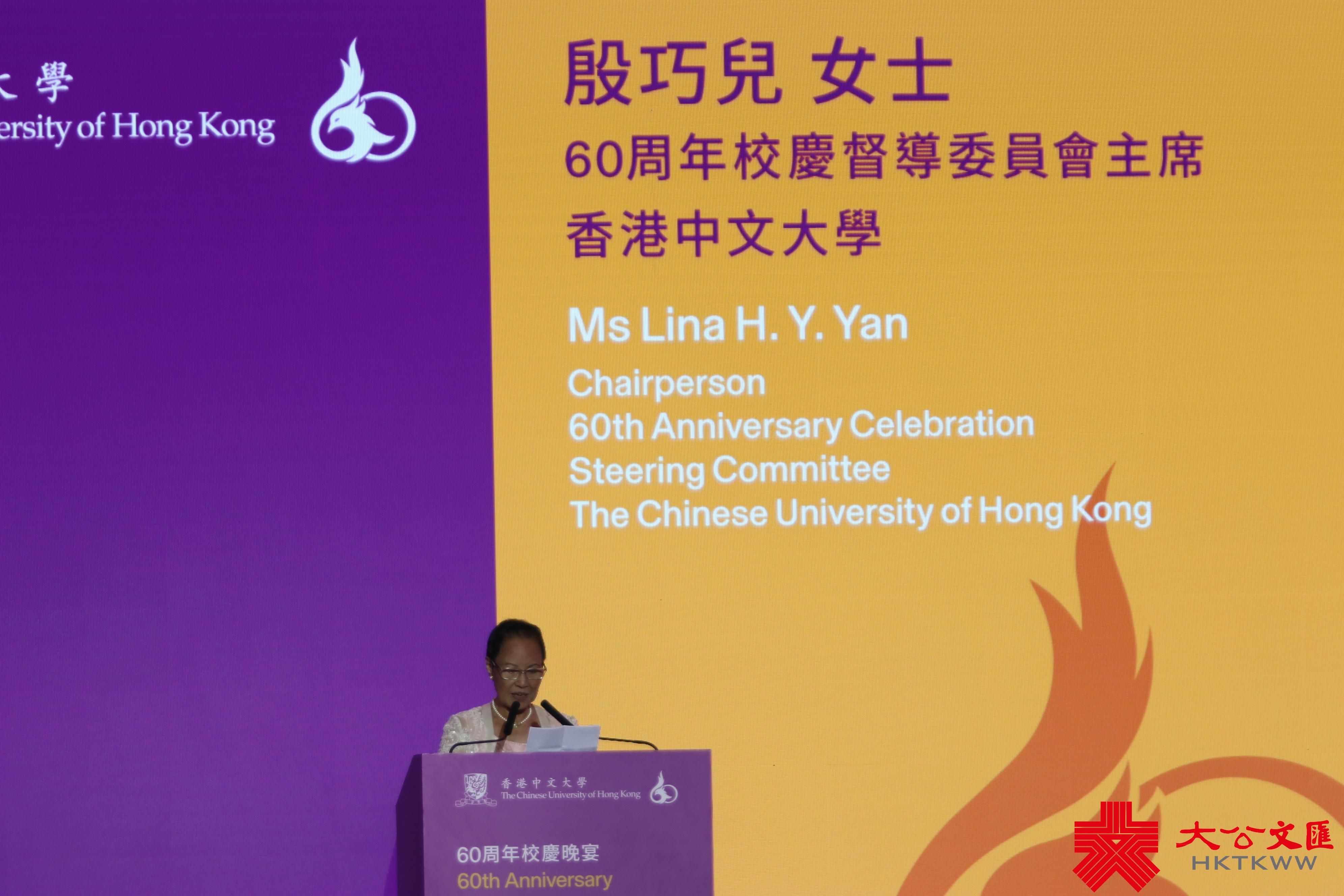 中大60周年校慶督導委員會主席殷巧兒表示,自己作為中大校友,參與組織母校的慶典而感到光榮,亦認為各個團體為組織校慶活動等項目的努力充分體現校慶的口號「甲子連心,任重致遠」所承載的團結精神。她祝願中大能繼續「茁壯成長、砥礪奮發」,在教育、研究、創新以及服務等範疇創造無限可能。