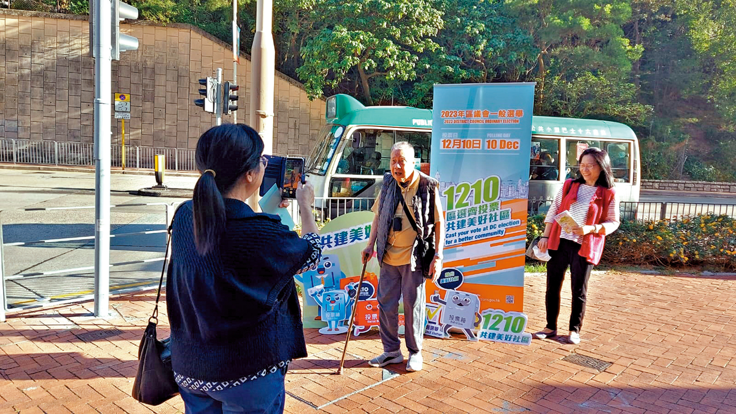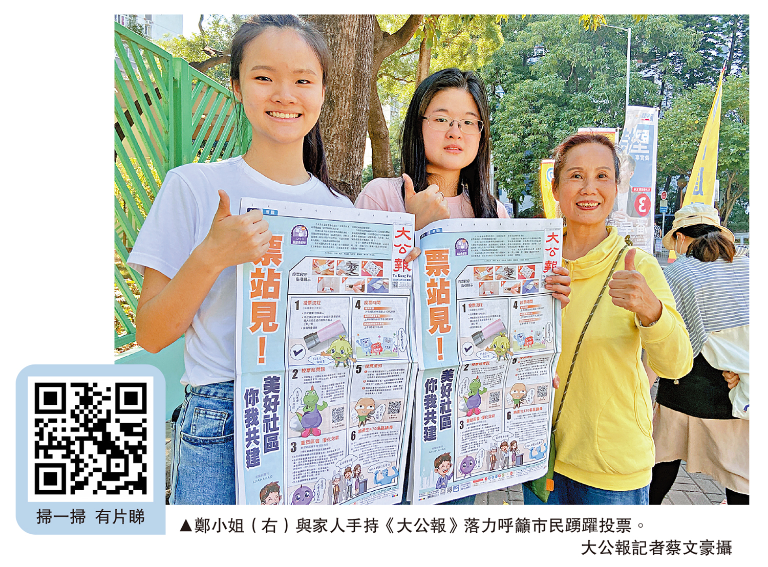 「上屆區議會也有投票,今次再來投票是為了公民責任。」街坊程女士表示,期望當選者可以做實事惠民生。她稱讚政府設置「打卡」位,投票後隨即在票站外,手持心意卡「打卡」,與同行家人拍照留念。