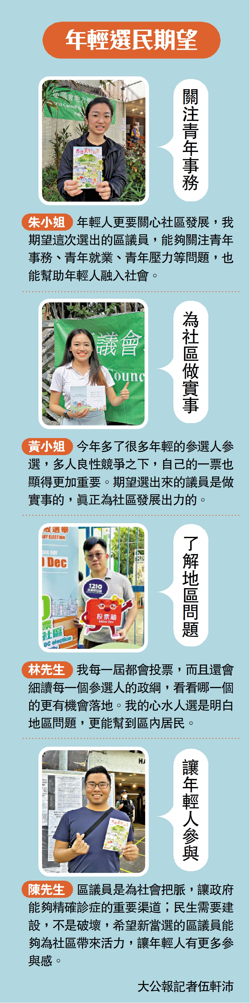 (大公報 記者 伍軒沛)「我是第一次投票,年輕人更要關心社區發展。」今年20歲出頭的朱小姐,在昨日區議會選舉投票日,從屯門蝴蝶邨的投票站走出來,手上拿着投票後政府派發的心意卡。她是「首投族」,第一次在議會選舉參與投票,她認為投票是公民責任,所以今年特意登記做選民。同樣是「首投族」的黃小姐說,她所屬地區在今屆區選的候選人數較往年多,激發她投票的意欲。