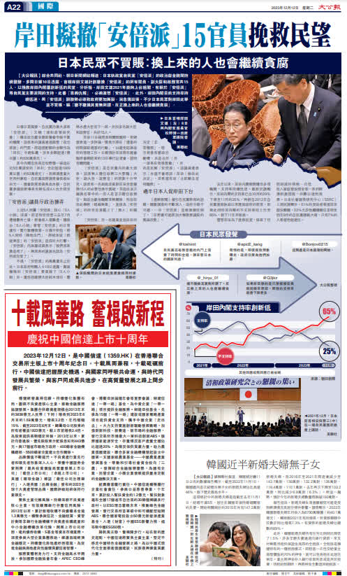 大公報綜合共同社、朝日新聞網站報道:日本執政黨自民黨「安倍派」的政治獻金醜聞持續發酵,多間日媒10日透露,首相岸田文雄計劃撤換「安倍派」的所有閣員、副大臣和政務官共15人,以挽救岸田內閣屢創新低的民望。分析指,岸田文雄2021年能夠上台組閣,有賴於「安倍派」等自民黨主要派閥的支持,此番「恩將仇報」,必將激怒「安倍派」。此外,岸田內閣目前支持率持續低迷,與「安倍派」翻臉勢必導致政府更加撕裂。消息傳出後,不少日本民眾對岸田此舉並不買賬,稱「撤不撤換其實無所謂,反正換上來的人也會繼續貪腐」。