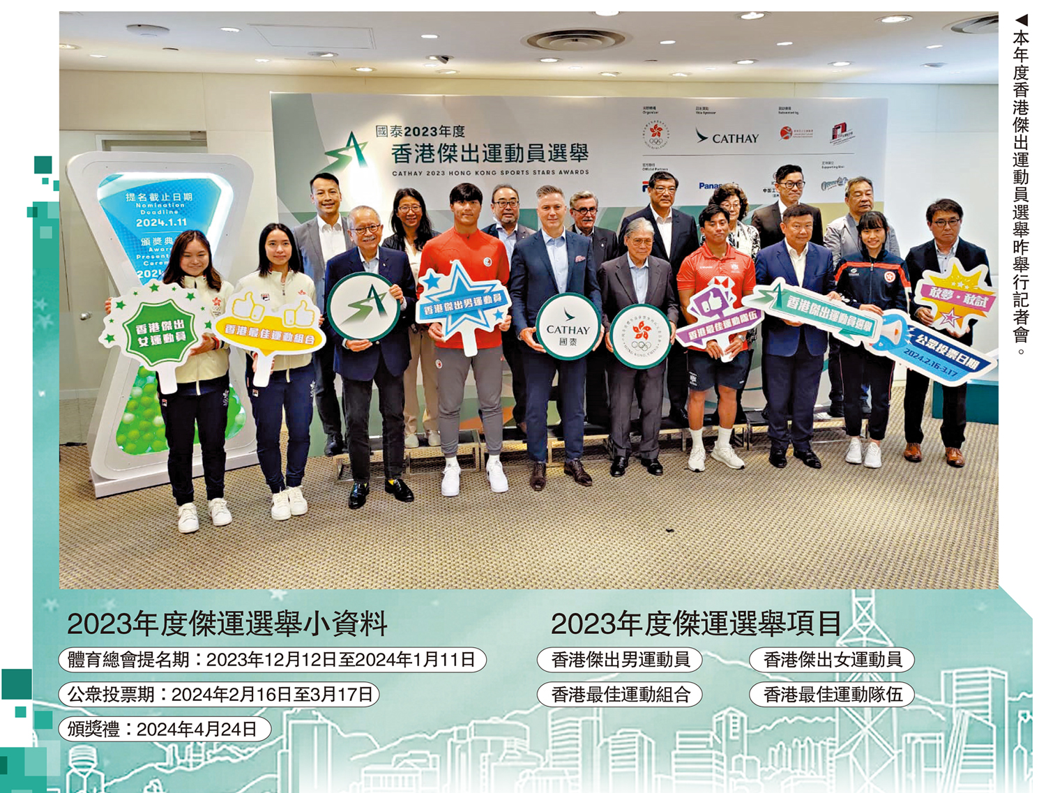 (大公報記者 張銳)2023年度香港傑出運動員選舉今天起接受各體育總會提名。中國香港體育協會暨奧林匹克委員會(港協暨奧委會)昨天在奧運大樓公布有關選舉詳情,公眾投票期將由明年2月16日至3月17日進行,頒獎禮則定於明年4月24日在香港會議展覽中心舉行。香港運動員在本年度成績優越,相信在傑出男、女運動員,最佳運動組合以及最佳運動隊伍這4個獎項中,一眾精英運動員勢必「爭崩頭」。