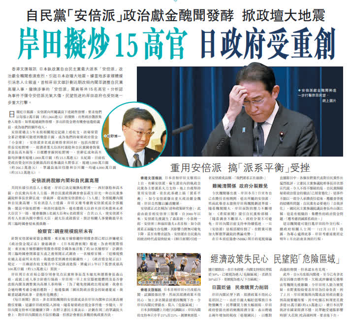 香港文匯報報道,日本執政黨自由民主黨最大派系「安倍派」政治獻金醜聞愈演愈烈,引起日本政壇大地震。據當地多家媒體援引消息人士報道,首相岸田文雄計劃近期改組內閣並調整自民黨高層人事,撤換涉事的「安倍派」閣員等共15名高官。分析認為事件不僅令安倍派元氣大傷,民望低迷的岸田政府也受到進一步重大打擊。