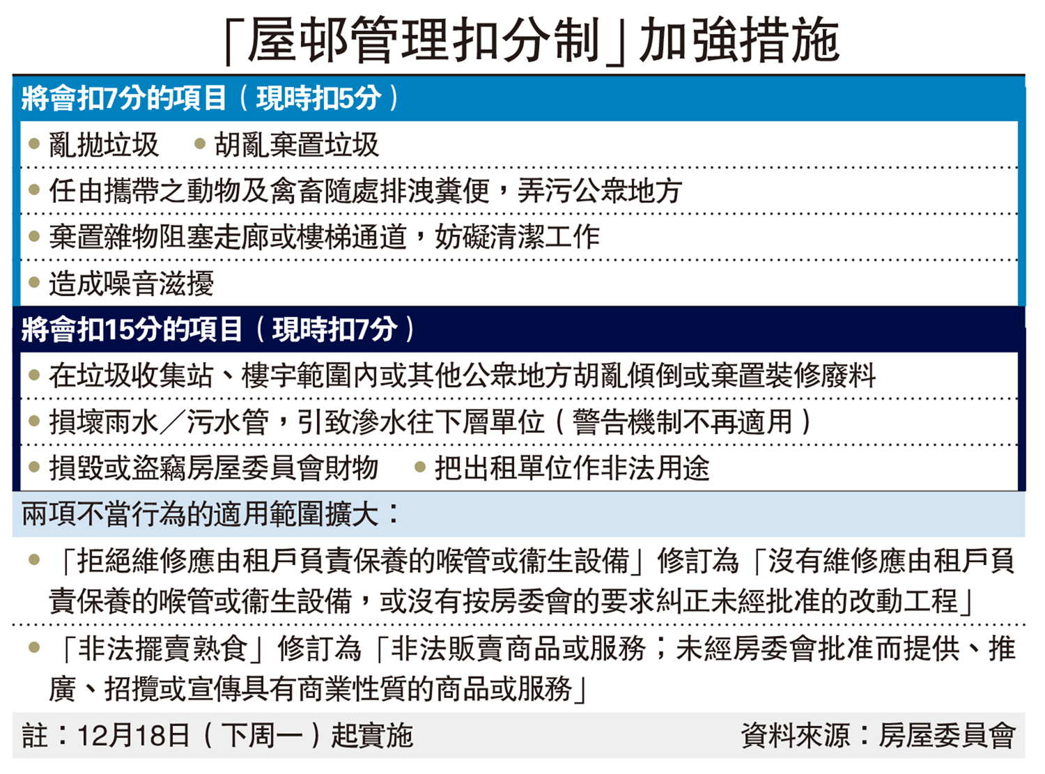 房委會公屋住戶在公共屋邨亂拋垃圾、棄置雜物阻塞走廊或樓梯通道、攜帶的動物及禽畜隨處便溺,或作出噪音滋擾等行為,現時可被扣5分,下周一起改為扣7分。而亂傾或棄置裝修廢料、損壞雨水/污水管引致滲水往下層單位、盜竊或損毀屋邨財物,以及出租單位作非法用途等,現時可被扣7分,下周一起改為扣15分。