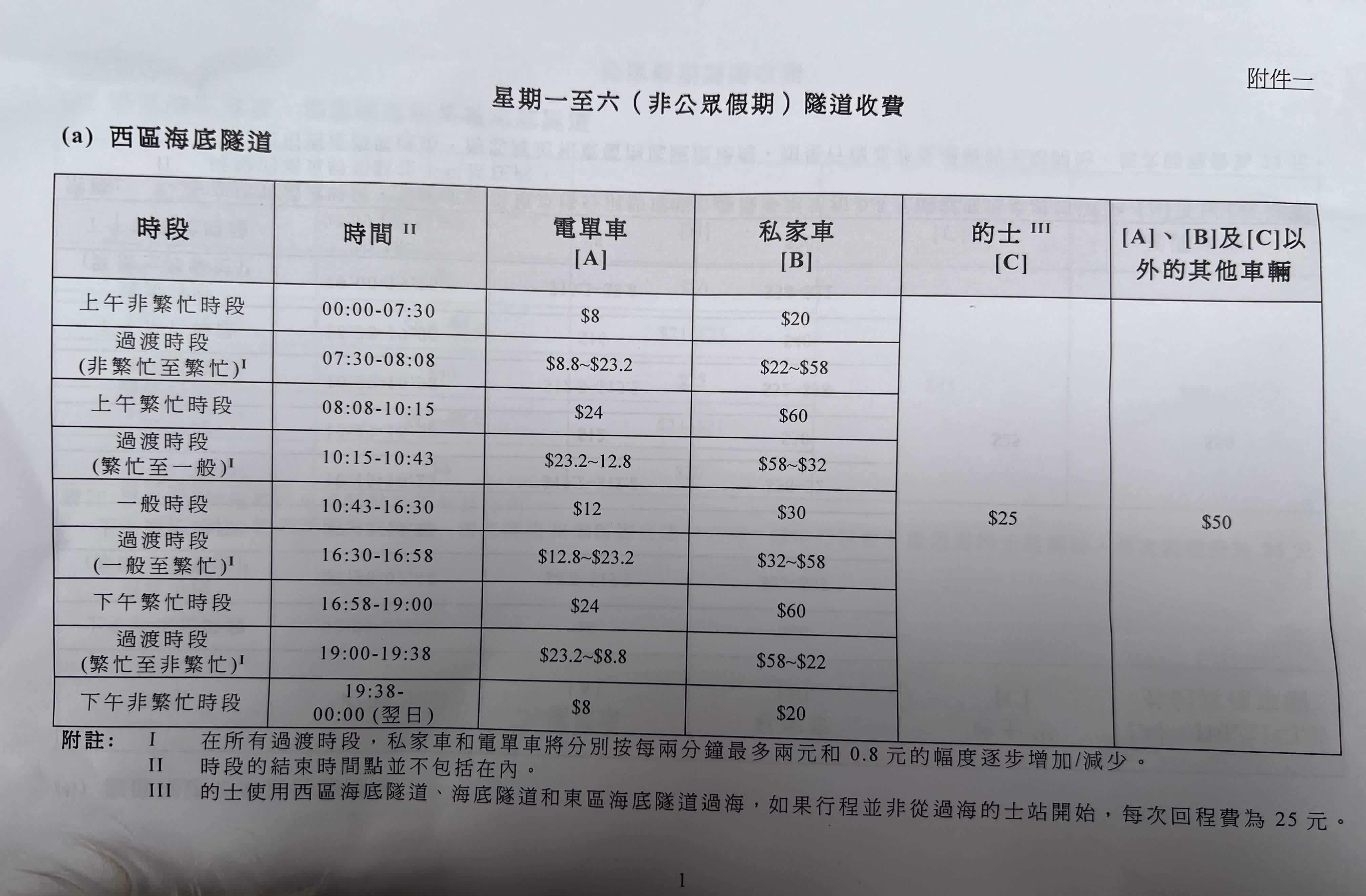 三、其他商用車輛包括貨車、巴士的三條過海隧道收費全日劃一為50元。