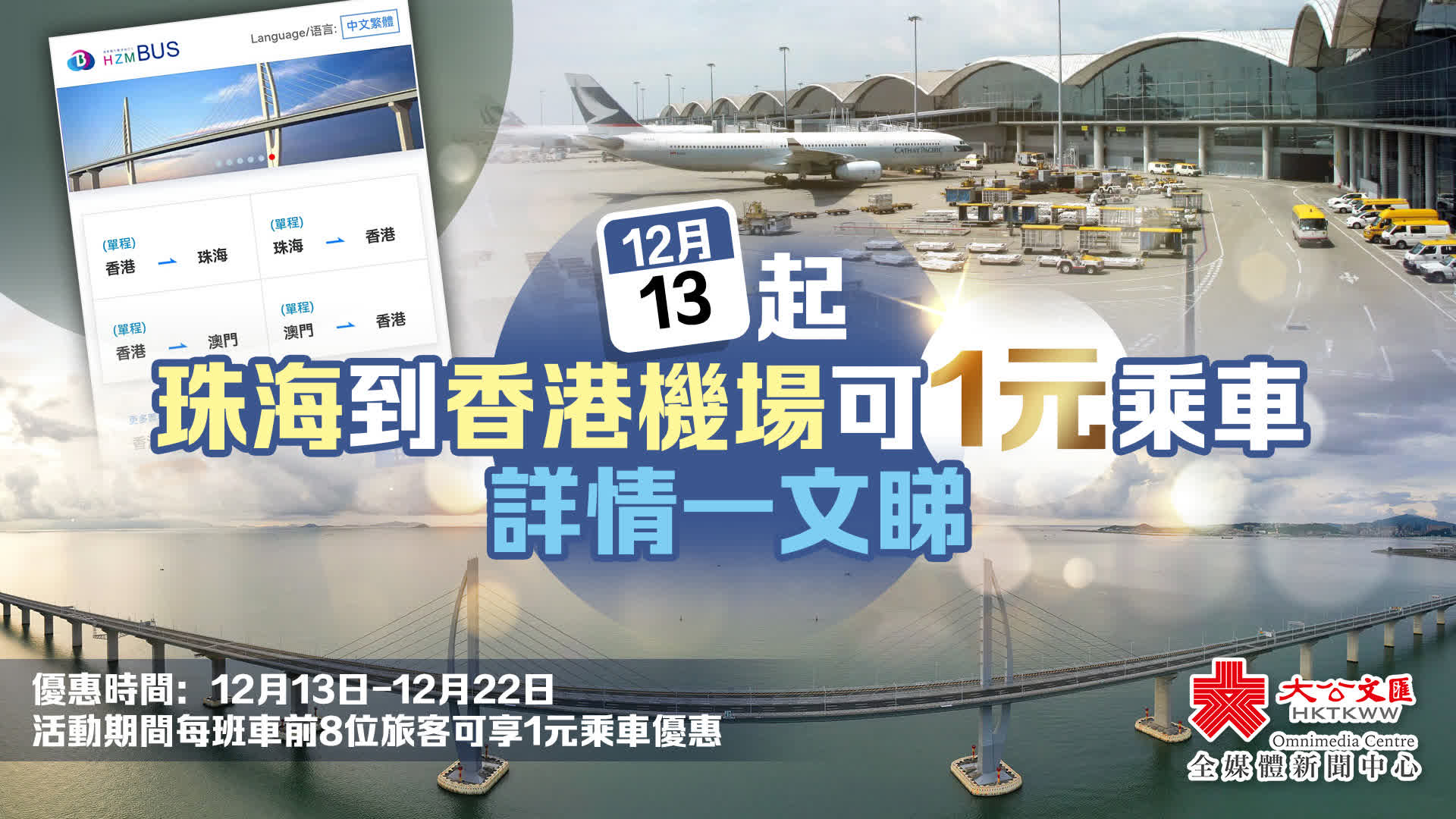 大公文匯全媒體報道,珠海市政府與香港機場管理局合作開展的「經珠港飛」客運項目昨天(12日)正式開通。港珠澳大橋穿梭巴士公司表示,聯合香港機場管理局推出香港機場海天中轉大樓客車(封關巴士)「優惠購票,1元乘車」優惠活動,優惠時間為今日(13日)起至下周五(22日)。從港珠澳大橋珠海公路口岸至香港機場海天中轉大樓的往返封關巴士已同步開通,已購買香港機場機票的旅客,可以通過「港珠澳大橋穿梭巴士」微信公眾號購買封關巴士車票。