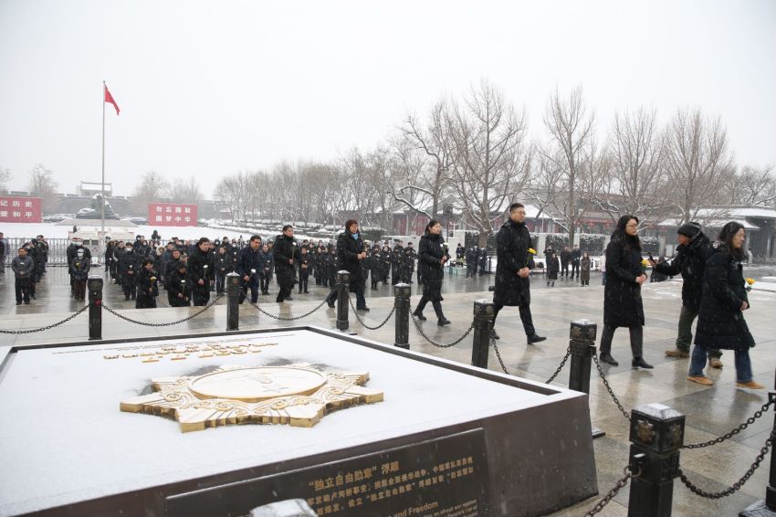 13日上午,在中國人民抗日戰爭紀念館館前廣場,參加悼念活動的人員在雪中整齊列隊、秉花肅立。10時,伴隨着奏樂,全體高唱中華人民共和國國歌《義勇軍進行曲》。隨後,全體人員垂首肅立,為死難者同胞沉痛默哀。