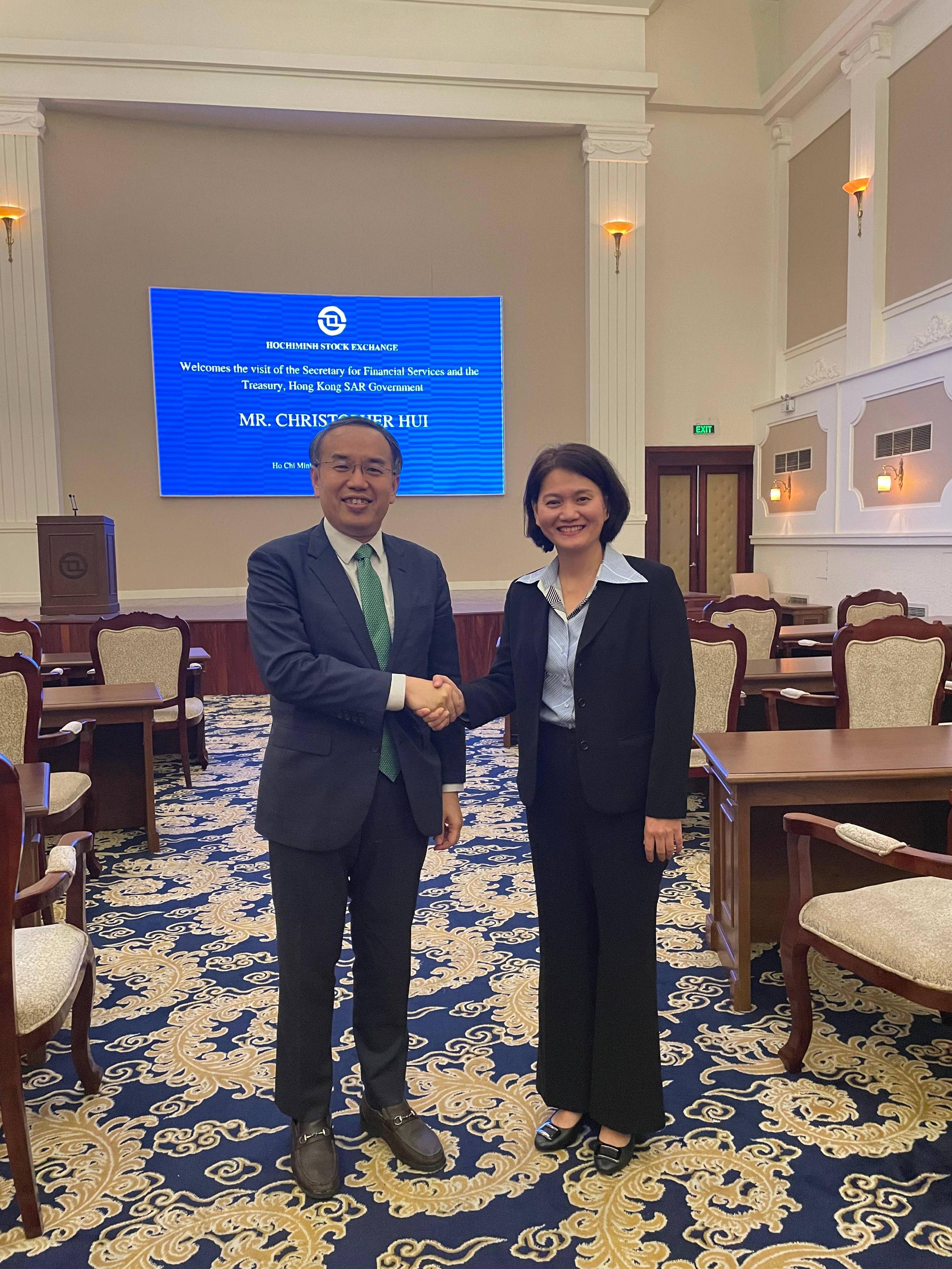 另外,許正宇今日會見越南銀行業協會秘書長阮國雄博士,雙方就環球經濟不確定的情況下如何維持金融體系穩健交換意見,並探索金融科技和綠色金融等範疇的合作。胡志明市證券交易所署理主席Nguyen Thi Viet Ha今日與許正宇會面,討論雙方共同關注的議題。