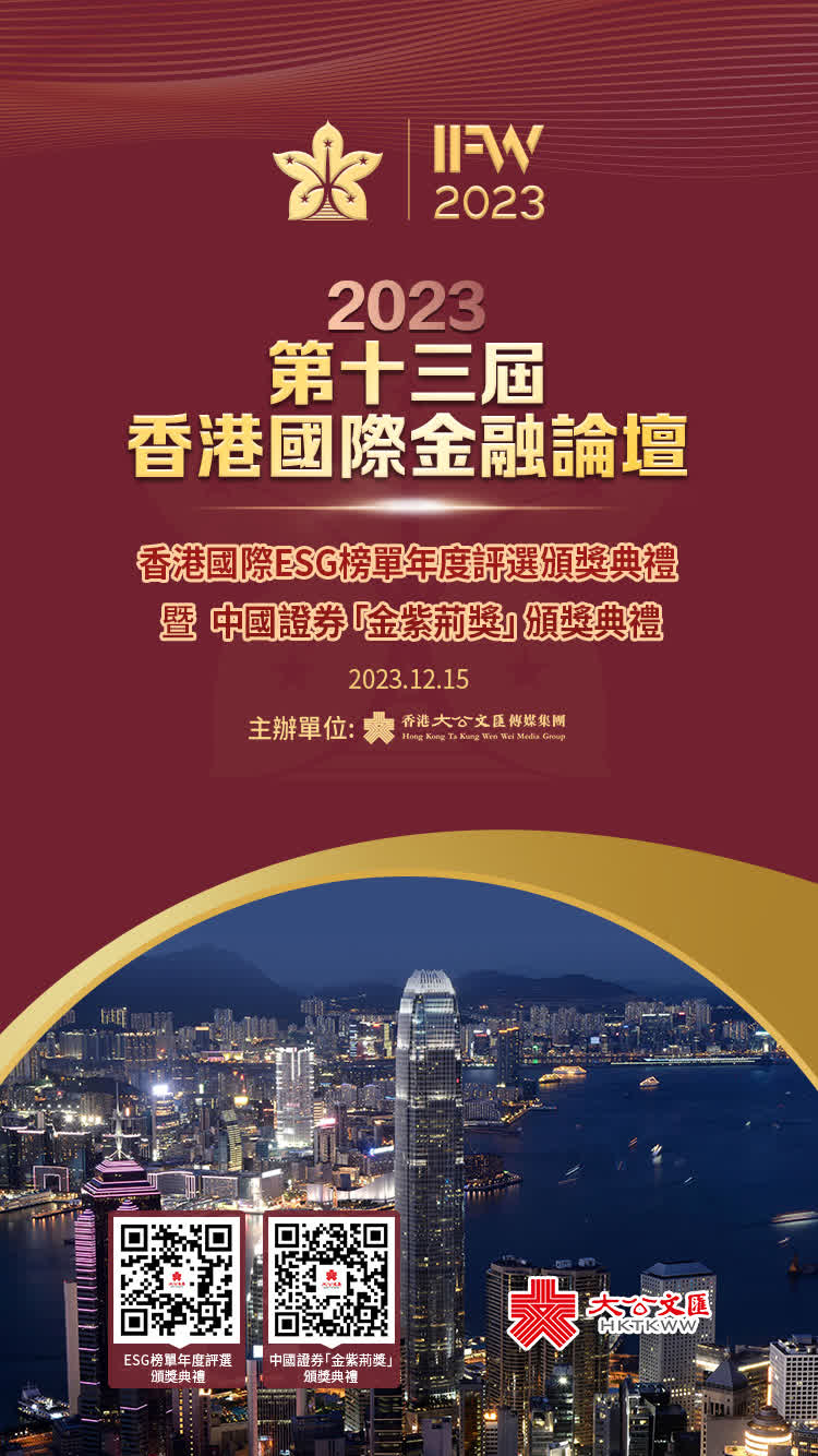 「展現新氣象 譜寫新篇章」——2023第十三屆香港國際金融論壇 香港國際ESG榜單頒獎典禮 暨 中國證券「金紫荊獎」頒獎典禮,將於12月15日假香港君悅酒店宴會廳舉行。大公文匯網屆時將進行現場直播。