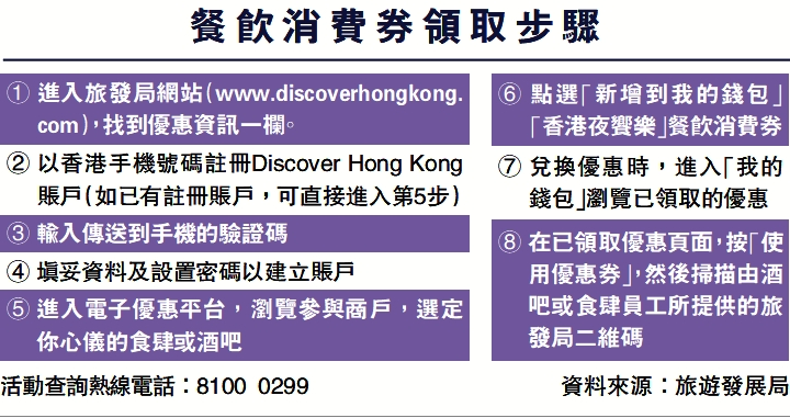 有興趣搶券的市民,可於Discover Hong Kong網站的電子平台預先註冊登記賬戶,下周三上午10時起,可以先到先得形式,免費領取首批餐飲消費券。每個賬戶同一時間只可領取一張消費券,必須在商戶兌換後,才可再領取新一張券。若同枱顧客同樣持有該消費券,亦可在帳單疊加使用。