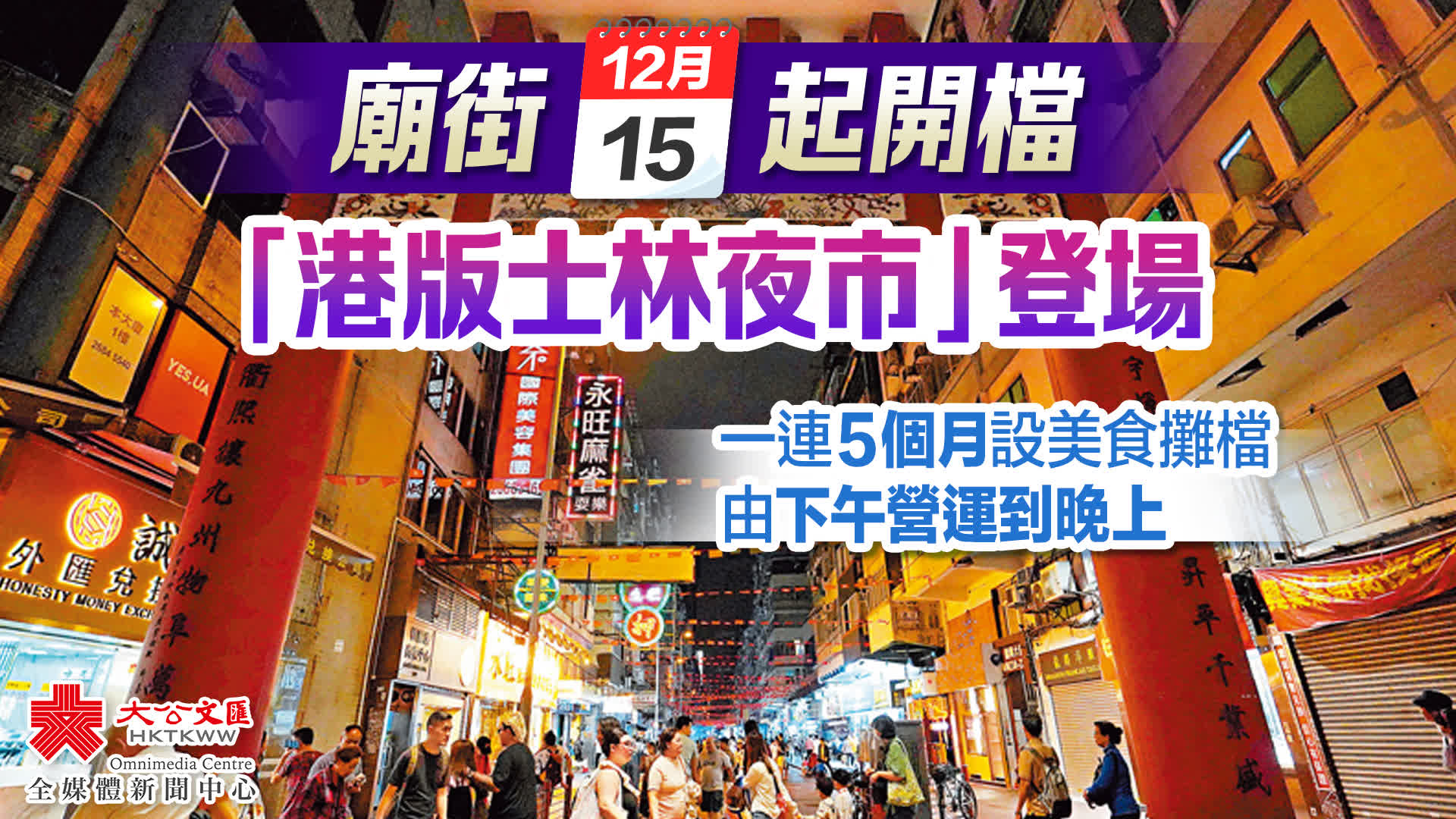 大公文匯全媒體報道,特區政府早前推出一系列「香港夜繽紛」活動,當中包括研究提升廟街夜市氛圍。為配合香港夜繽紛,旅發局與商販設立廟街夜市,將於明日(15日)開鑼,設超過20檔攤檔及部分流動攤位,初步將試行5個月,每日由下午營運到晚上。