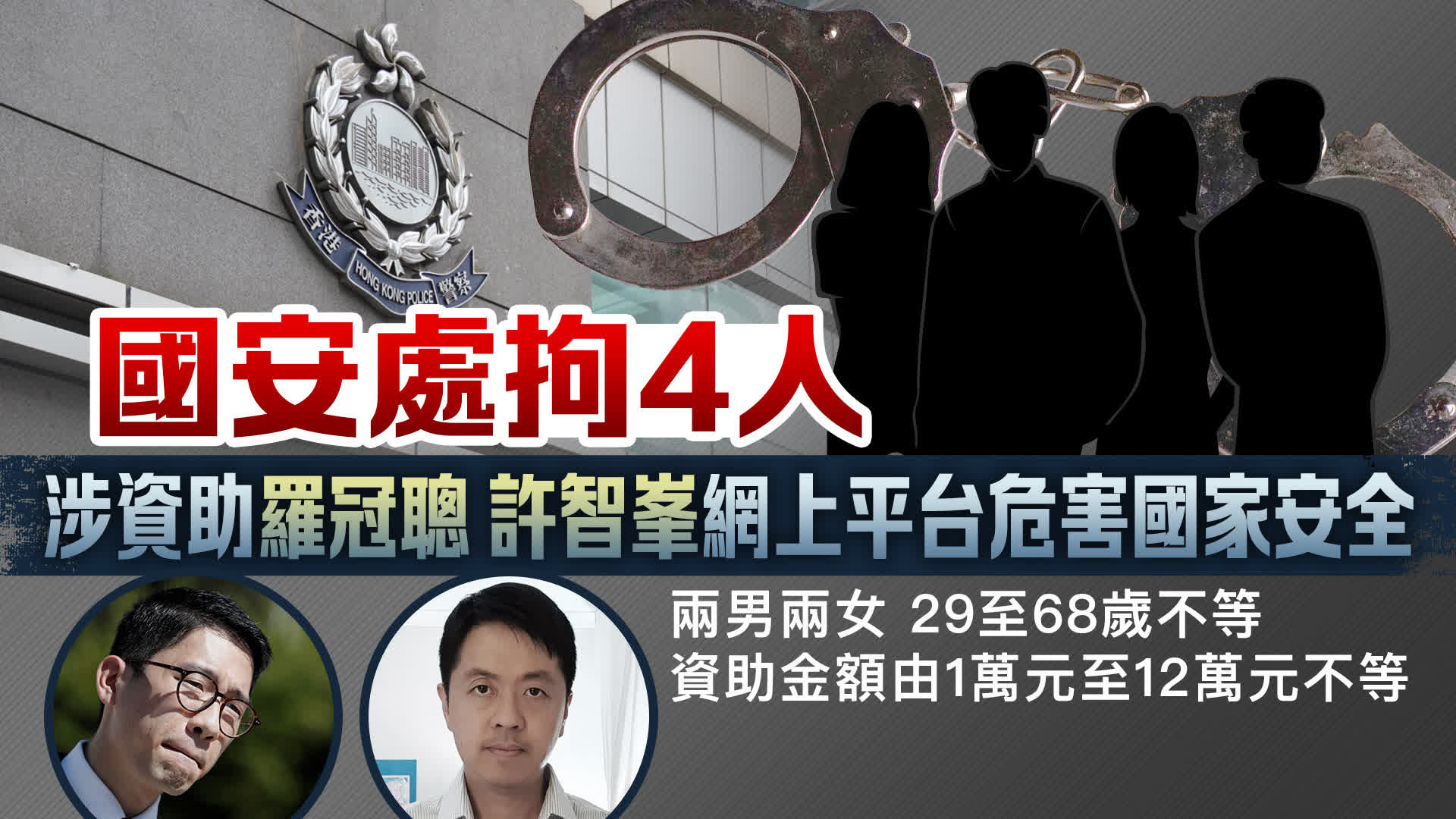 警方指,國安處的調查顯示,羅冠聰和許智峯透過該平台獲取的資金,去實施危害國家安全的活動。國安處人員掌握到充分證據,有4名香港本地人士,包括兩名29及68歲的男子,及兩名分別為56及59歲的女子,他們報稱的職業是電梯技工、補習老師、退休人士等,他們自2020年12月到2023年11月期間,透過網上訂閱者平台資助羅冠聰和許智峯進行危害國家安全的活動。他們資助的金額分別由1萬元至12萬元不等。調查亦顯示,他們有瀏覽羅冠聰和許智峯網上訂閱者平台賬戶,因此,警方昨日(13日)在香港4個地點採取執法行動,拘捕4人,現正被扣留調查,警方表示行動仍會繼續。