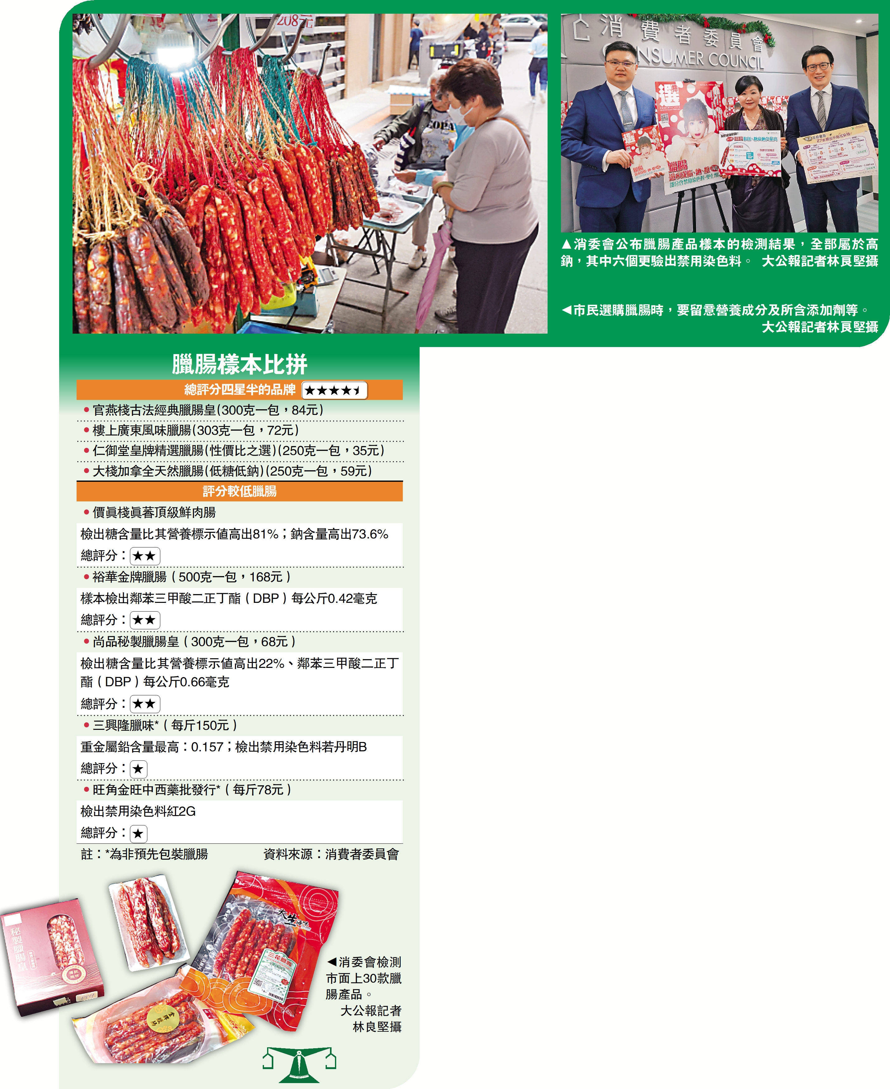 消委會按照營養成分、添加劑和污染物的含量,以及營養標籤的準確度作評分,「官燕棧」的古法經典臘腸皇、「樓上」的廣東風味臘腸、「仁御堂」的皇牌精選臘腸、「大棧」的加拿全天然臘腸,均獲得四星半評分,其中以「仁御堂」性價比最高,250克五至七條裝只需35元;「大棧」屬低糖低鈉。