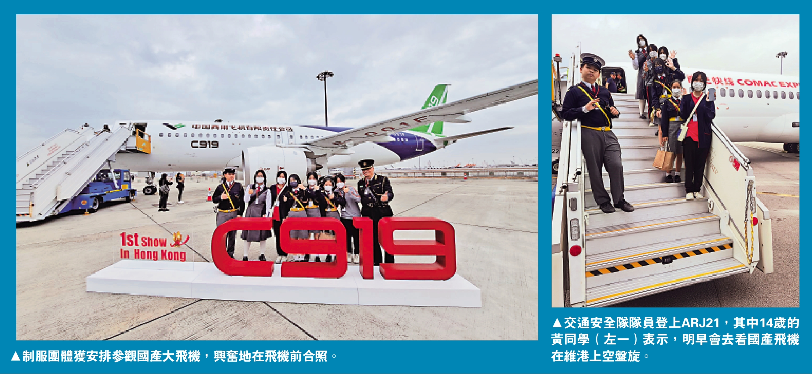 今年讀中學三年級的14歲黃同學,昨日與同學跟隨交通安全隊參觀兩架國產飛機的靜態展示,他戴上機長機師帽子,帥氣地和C919機長合照。「第一次走進機場禁區,親眼看到祖國研製的飛機,體驗很真實,這種跟國家航空科技有關的資訊,以往只能在網絡上看到。」他又說,空中服務員和機長非常和藹可親,帶着同學到處介紹和參觀。大飛機明早會在維港上空盤旋,他已準備前往觀看,「靜態的看過了,再看一次動態的,感覺更完整。」