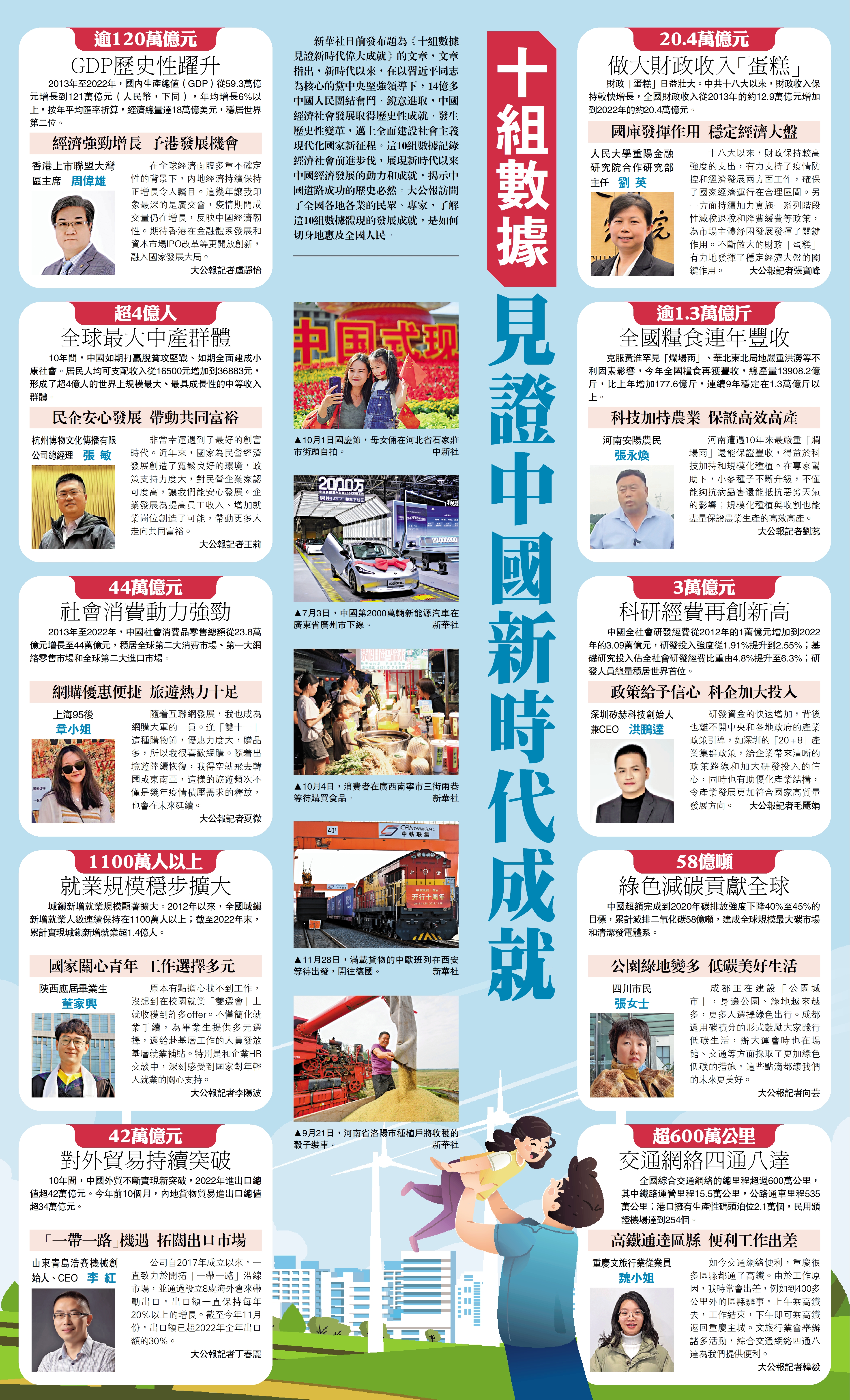 大公報綜合新華社報道,新華社日前發布題為《十組數據見證新時代偉大成就》的文章,文章指出,新時代以來,在以習近平同志為核心的黨中央堅強領導下,14億多中國人民團結奮鬥、銳意進取,中國經濟社會發展取得歷史性成就、發生歷史性變革,邁上全面建設社會主義現代化國家新征程。這10組數據記錄經濟社會前進步伐,展現新時代以來中國經濟發展的動力和成就,揭示中國道路成功的歷史必然。大公報訪問了全國各地各業的民眾、專家,了解這10組數據體現的發展成就,是如何切身地惠及全國人民。