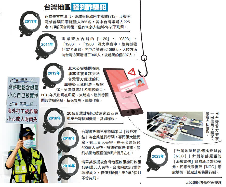 大公報援引台媒報道:台南地檢署近期追查一宗「泰達幣」詐騙案,向台南地方法院請求羈押11名詐騙集團成員,但法官裁定「無保」釋放(不需要交納保證金擔保而直接解除拘禁、恢復被告人自由),承辦檢察官對裁定結果錯愕、難以接受。島內民眾批評司法機構縱容犯罪。兩岸學者指出,台灣方面如此優待詐騙分子,如何能嚴厲打擊犯罪分子,難怪台灣近5年詐騙案的偵結起訴率只有21.9%。尤其民進黨政客與詐騙分子關係匪淺,可謂「上樑不正下樑歪」。